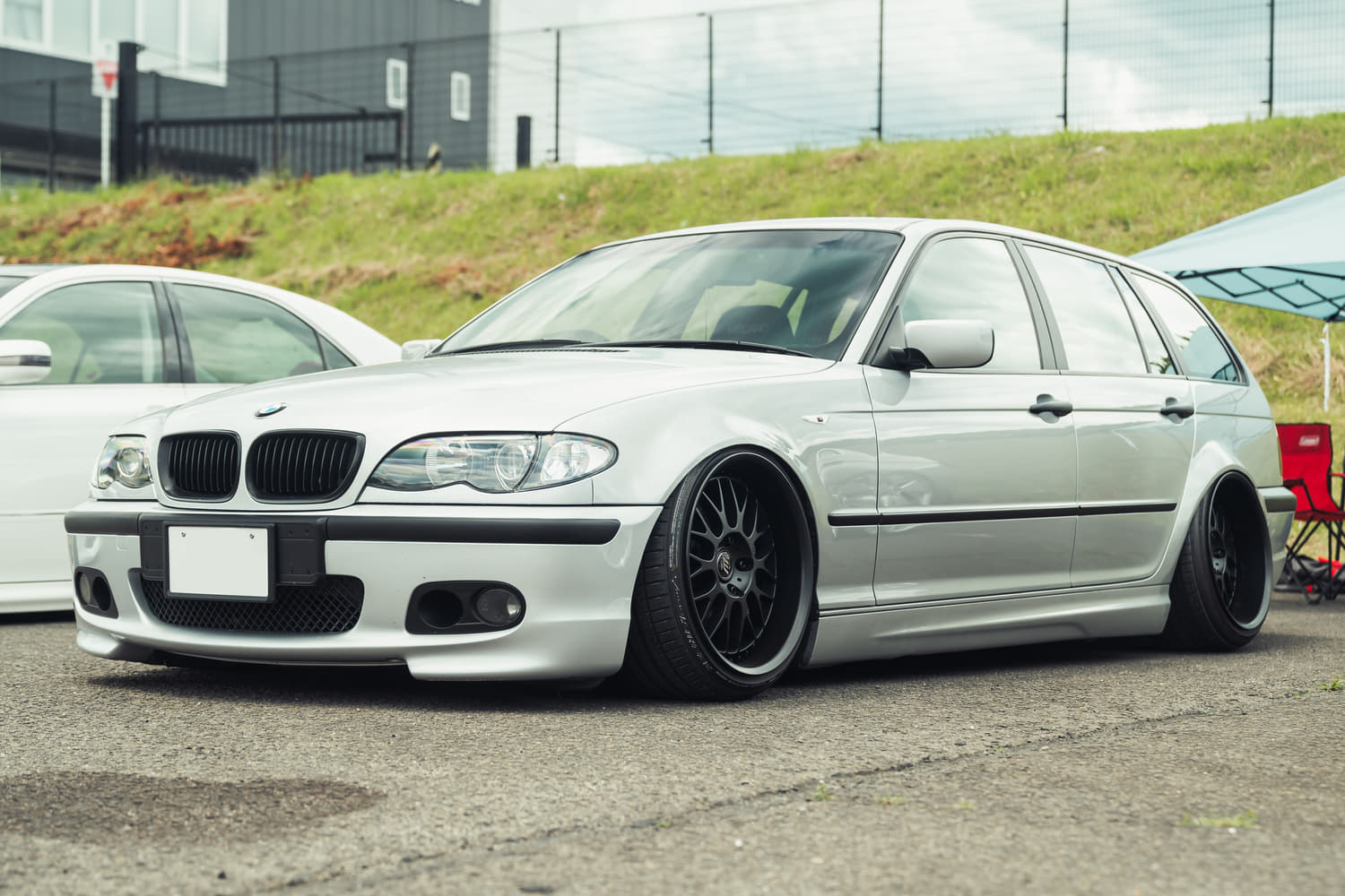 以前はホンダ「ラグレイト」や「エリシオン」など、ミニバンをカスタマイズしていた大内さん。現在乗っているBMW E46「318iツーリング」は、5年前に普段の足として購入した1台だ。移動の手段だから当然イジるつもりはなかったそうだが、「手を加えたら面白そうだな」と、悪い虫(?)が騒いで現在に至る。注目すべきは車高の低さとツライチセッティングにしている点だ。