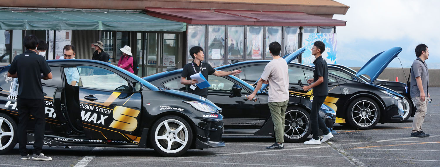 HKSの開発陣と参加者が一緒に試乗コースへと出向いていった。ダウンヒルの往路ではHKSの担当者が運転をし、ルートの説明をするとともに、車高調キットの特性や仕様といった基本的なスペックはもちろん、開発時の狙い、開発方法などを参加者に紹介する。そしてヒルクライムの復路で参加者がステアリングを握り、自身のドライブでそのフィーリングを体感するわけだ。