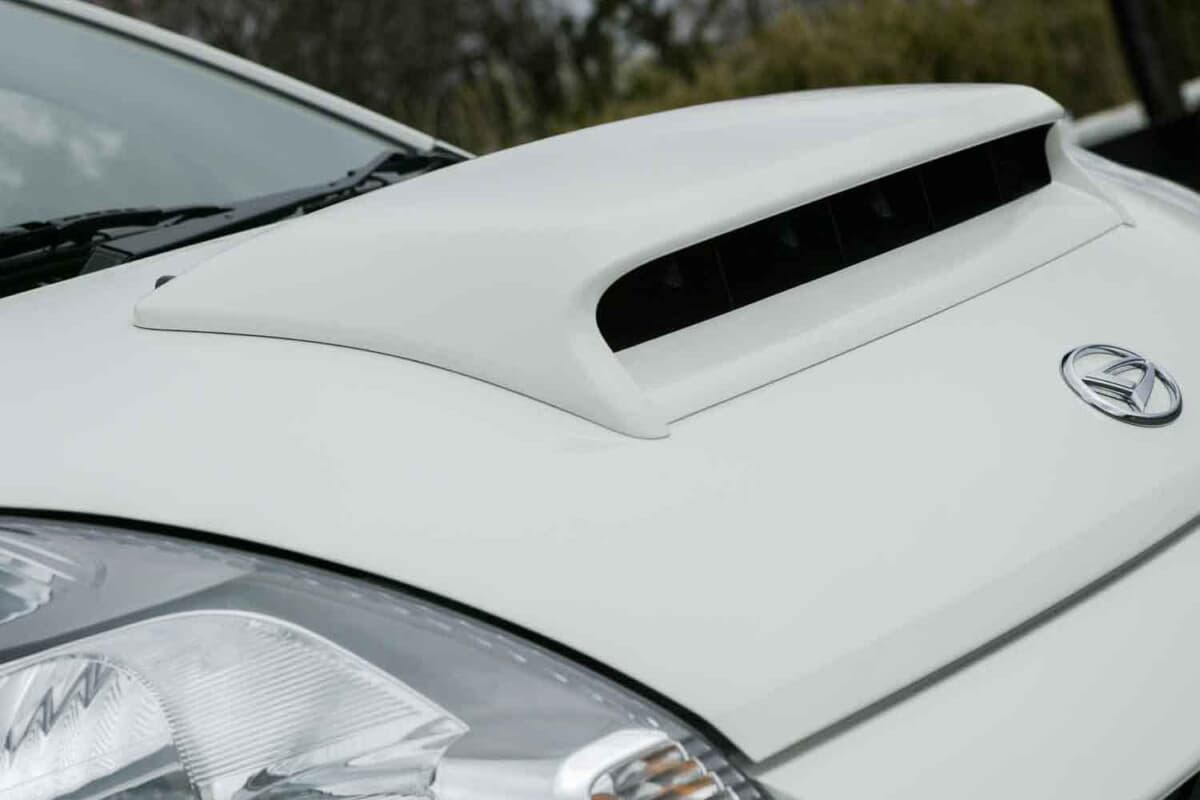 このように内部はモータースポーツベースとして本格的な仕様となっていたが、エクステリアはボンネットに備えられたインタークーラー冷却用のダクトと「X4」のステッカー以外はエアログレードの「カスタム」と同等のルックスで、タイヤもカスタムグレードと同等のエコ系タイヤ。室内もメーターフードの上に後付けのタコメーターが備わる以外は特別感もなく、シートもホールド性皆無の通常グレードと同じものが備わっていた。