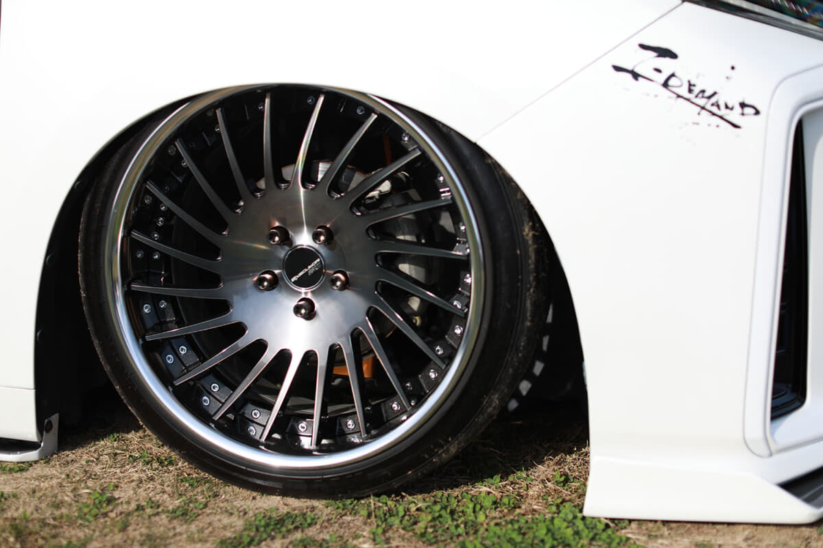 木村さんは、2度目の足まわり変更で着地スタイルを目指すことにした。そのために使用したエアサスは、エアフォース製。さらに完全に落とすために、ホイールはSSR製エグゼキューター05の20インチへと1インチほどサイズダウン。そしてアーム類はTディメンドを使用することで、ご覧の通りの完璧なスタイルを手に入れたのだ。