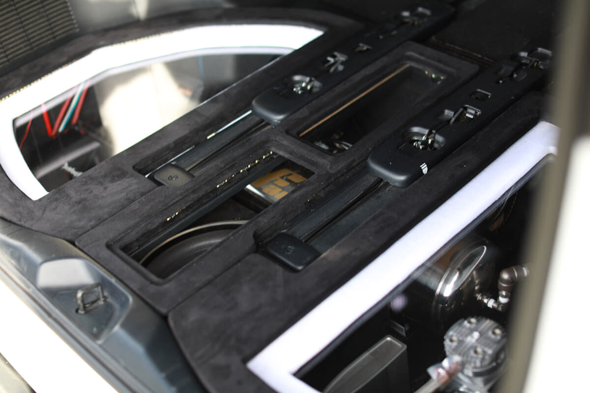 しかも、内部のオーディオシステムまで着手。リアのラゲッジスペース下には、ロックフォードのアンプ類が組み込まれ、さらに上部にもミッド&ツィーターを追加。座席部分にもAピラーへツィーターを増設するなど、オーディオカスタムも抜かりなく仕上げているのだ。