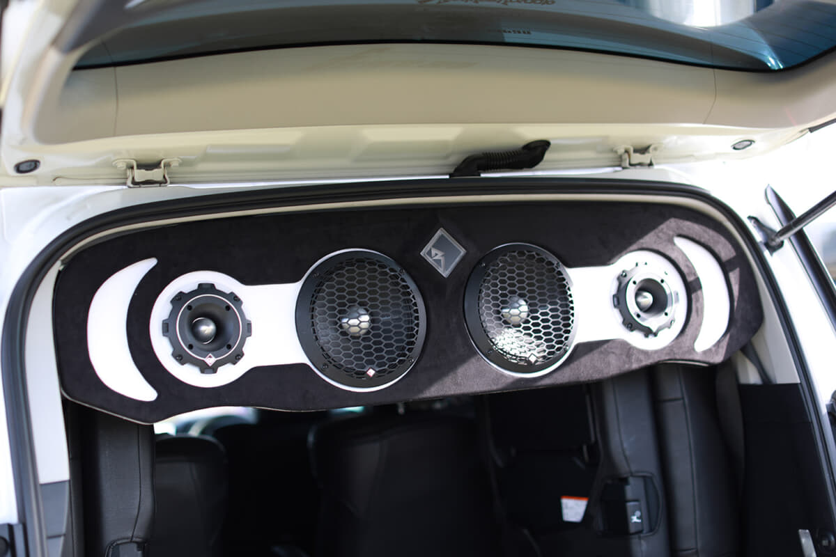 「オーディオを組んでも、荷物を載せるスペースは確保したいので、このラゲッジ下のシステムは、普段はカバーをして隠すことで、問題なく積載できるようにしています。上部のスピーカーシステムも実は取り外し式になっているので、日常ではこれを外しています。あくまでもファミリーカーなので、実用性はちゃんと考えてカスタムしました」