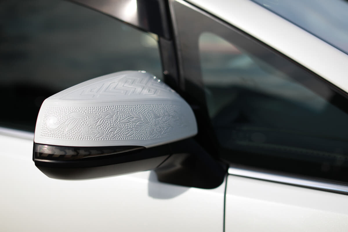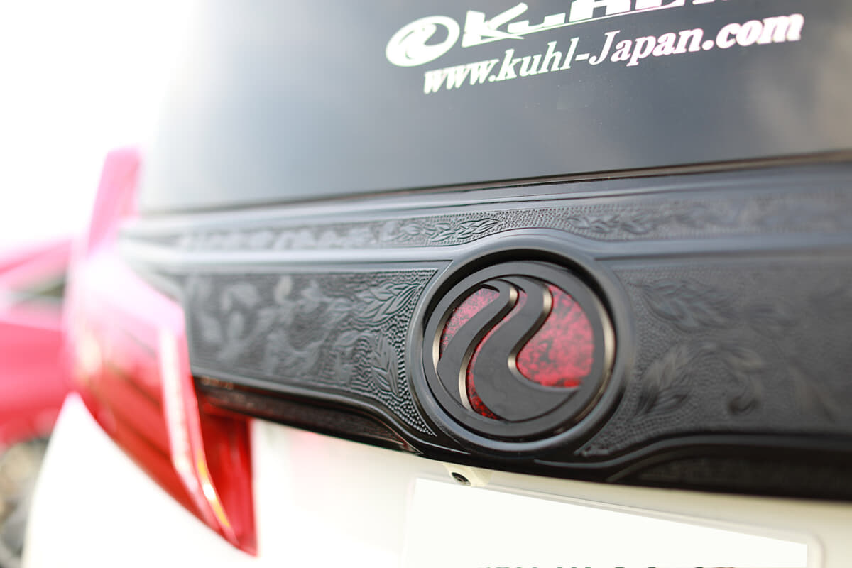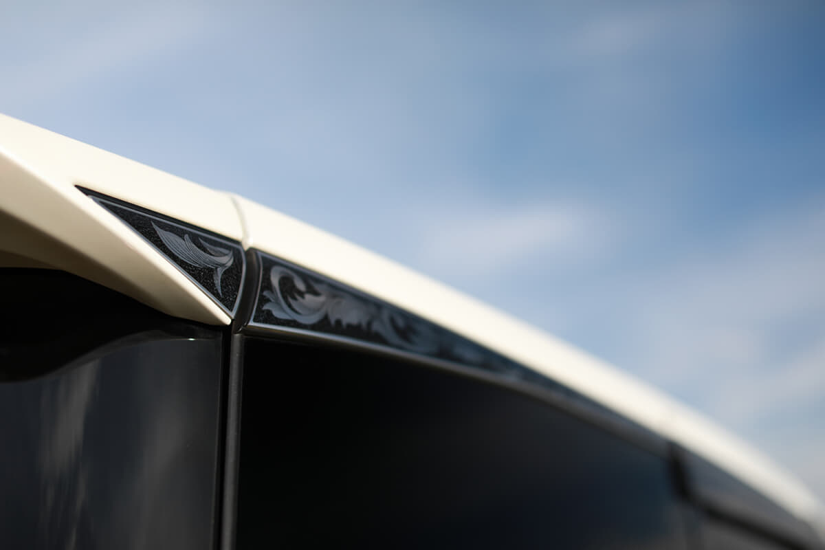 外装各部には、何気にエングレービング(版画のような凹版技法)による自作の手掘り柄も施した。シンプルで高級感あるアルファードにひと手間加えて、独特の雰囲気を演出しているのもポイントだ。