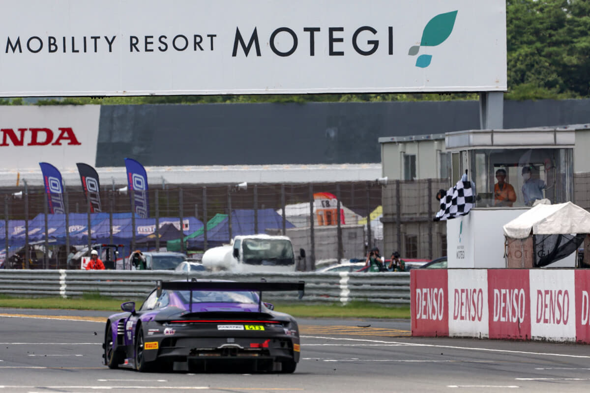 レース2は何度もセーフティカー(SC)が導入される荒れた展開に。残り20分となったところでホームストレートでクラッシュが発生した際には、SCに続いてピットロードを通過するようレースコントロールから指示が出されたが、無線のトラブルなどもあって多くのマシンがホームストレートを通過。トップチェッカーを受けたDステーション・レーシングの47号車 アストンマーティン・バンテージAMR GT3も7位に降着する荒れたレースとなった。GT4ではチェックショップ・ケイマニア・レーシングの718号車 ポルシェ・ケイマン718 GT4 RSクラブスポーツ(大塚直彦/小林翔)がクラス優勝を果たしている。