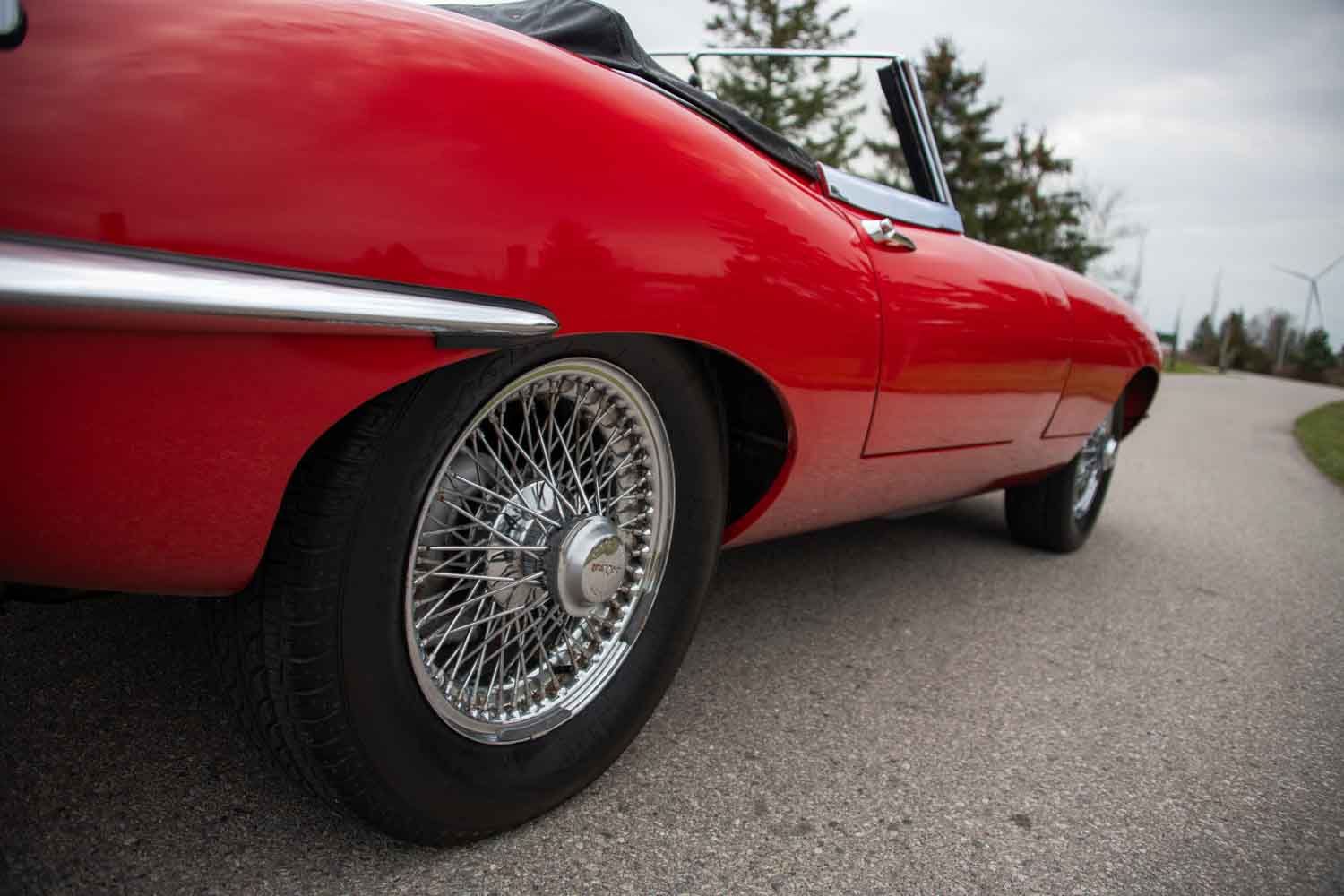 新車として作られた当時、このEタイプは「オパールセント・マルーン」のボディにベージュのインテリアの組み合わせで仕上げられていたが、現在はレッドのボディカラーにブラックのトリム&ソフトトップという、ハンサムなオールドスタイルのレストアが施されている。