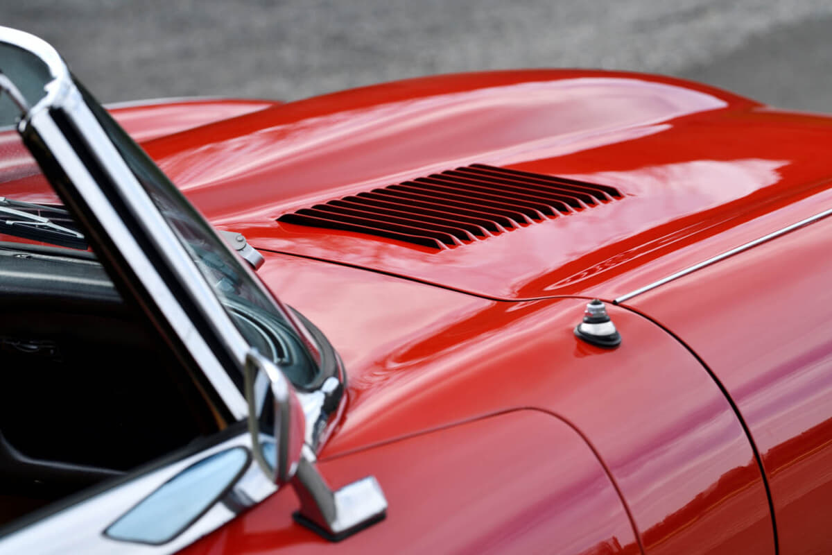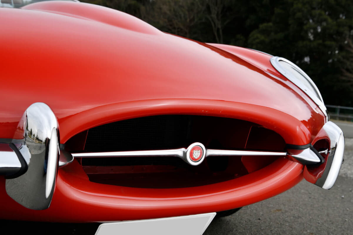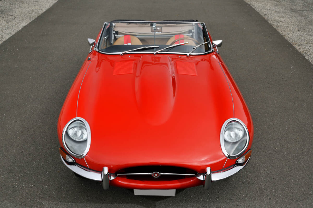 • この真紅のEタイプは1964年式。つまり3.8L時代のシリーズ1最終型で、ボディタイプはオープンモデルの「OTS(Open Two Seater)」