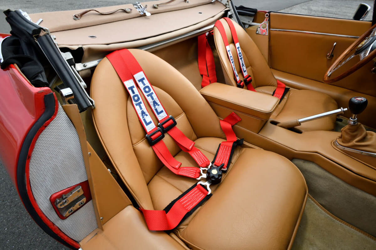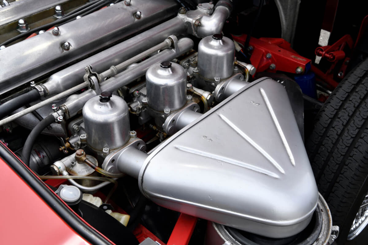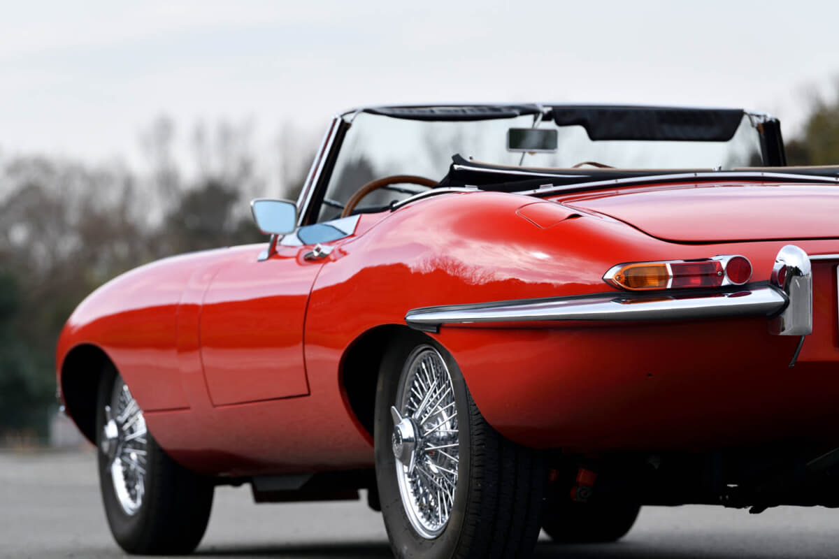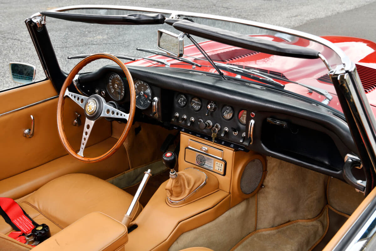 • この真紅のEタイプは1964年式。つまり3.8L時代のシリーズ1最終型で、ボディタイプはオープンモデルの「OTS(Open Two Seater)」