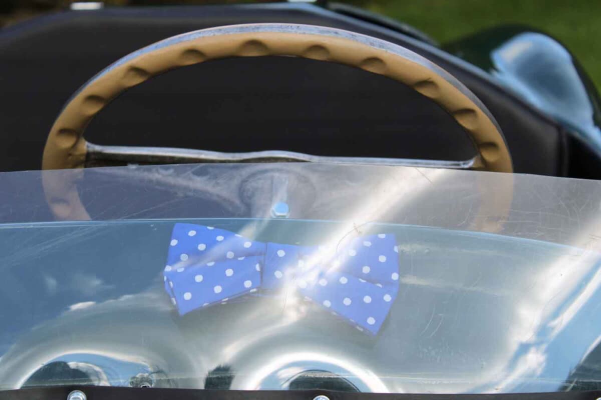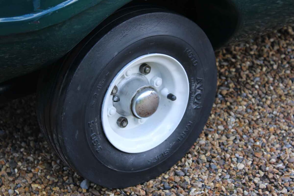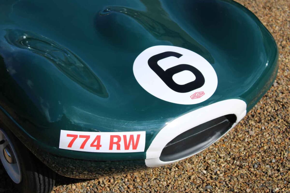 ボディカラーや仕様の選択肢は幾つか存在したようだが、今回の出品車は1955年のル・マン24時間レースで優勝したマイク・ホーソーン/アイヴァー・ビューブ組のワークスカー「774 RW」のカラーリングを模したもの。専用のスチール製チューブラーフレームに、ブリティッシュ・レーシング・グリーンにペイントされたファイバーグラス製モールド・ボディ、オールド・イングリッシュ・ホワイトのホイールを組み合わせる。