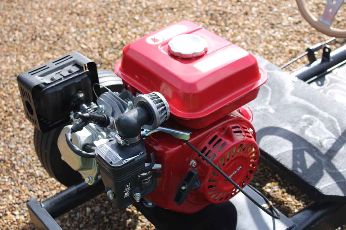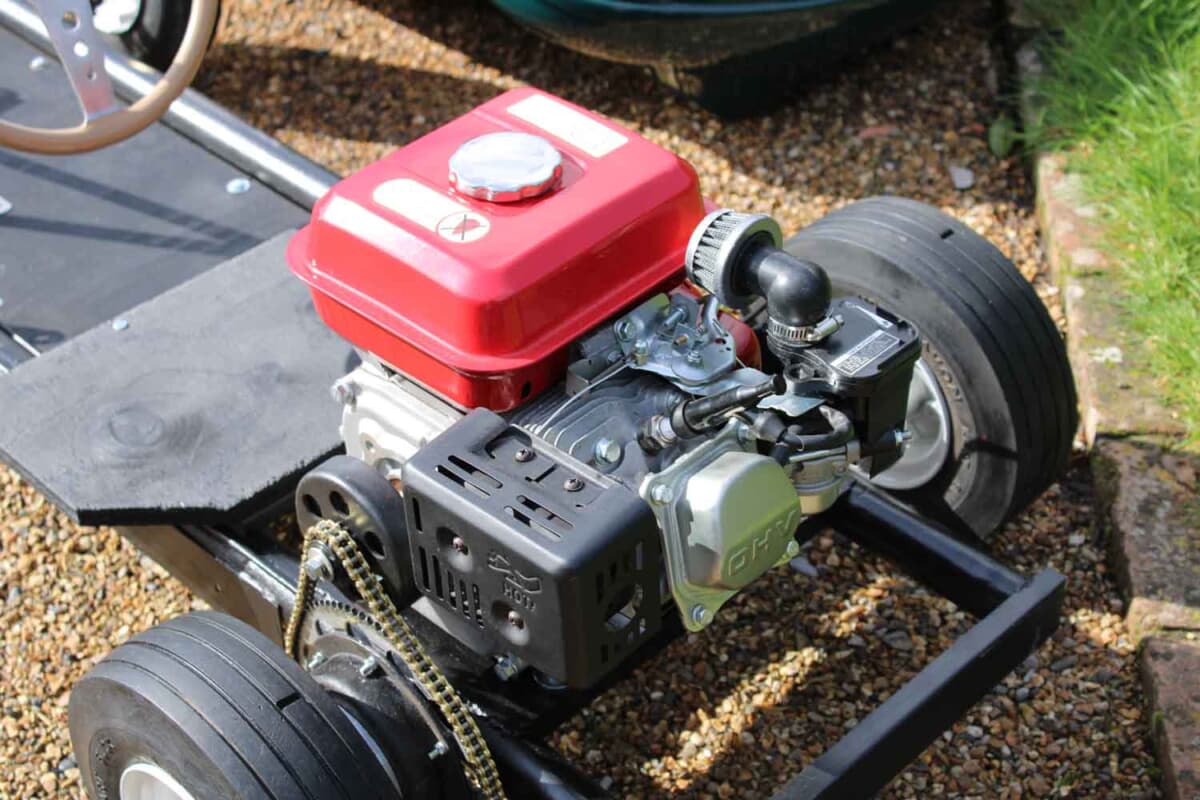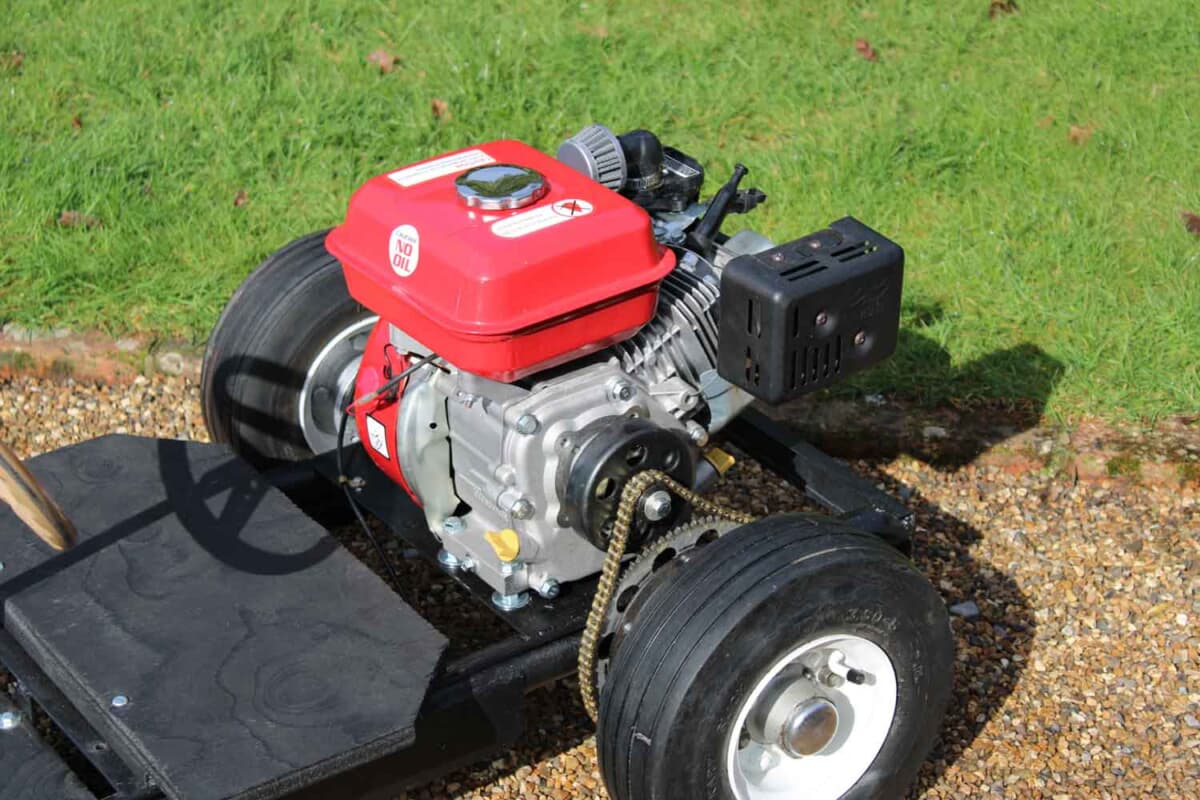 空冷単気筒2ストローク・74ccのエンジンは、チェーンを介して左後輪を駆動するクラッチに連結され、シンプルなアクセルペダルとブレーキペダルを持つ。