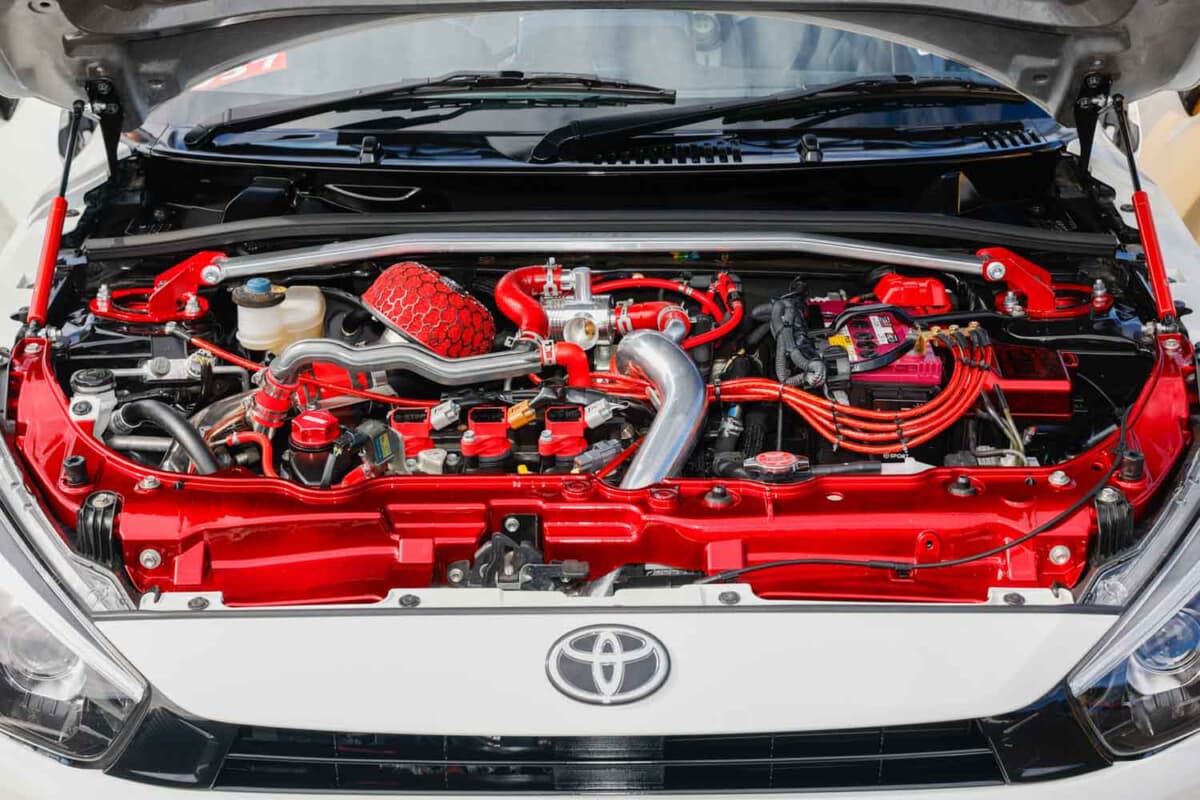 エアクリーナーのフィルターにアーシングのケーブル、オイルフィラーキャップにタワーバーのブラケット。ブローオフバルブの配管やコイルも赤にするほどの徹底ぶりで、よく見れば純正ヒューズボックスのカバーも塗装されている。