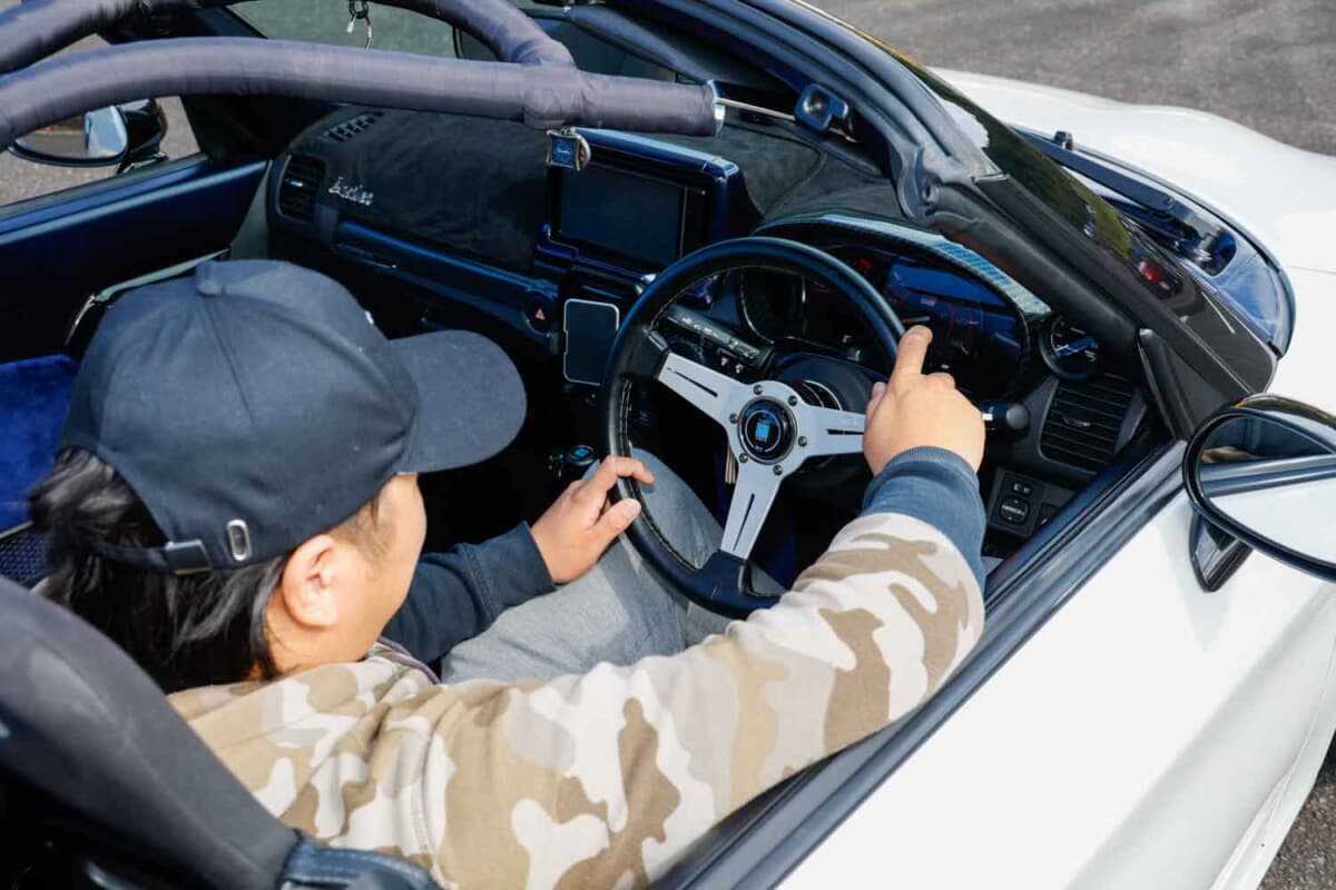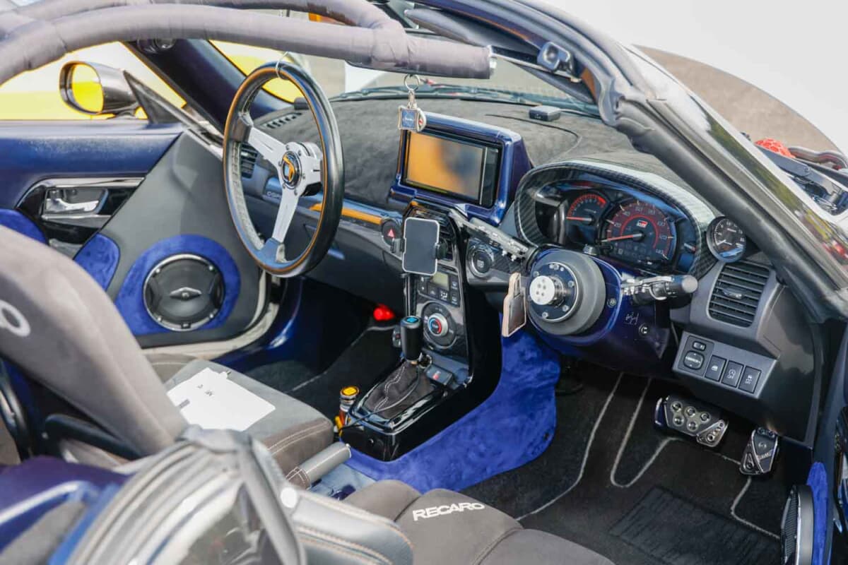 ビビッドなエンジンルームに対し、室内は高級感ある大人の雰囲気だ。センターコンソールやドアは部分的に落ち着いた青に張り替え、ダッシュボードはフロントガラスへの映り込みを考慮して黒に変更。ホールド性に優れたレカロのバケットシートにロールケージ、ナルディのステアリングでスポーティなイメージも強調する。