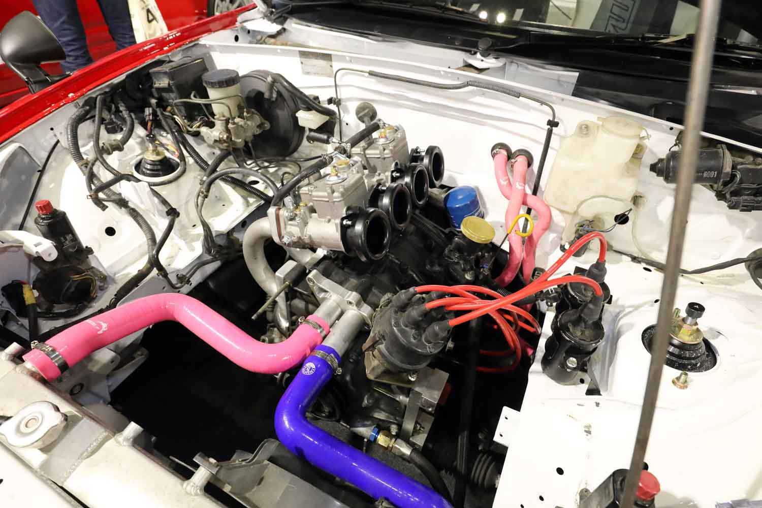 ちなみに、このパワーユニット、やはりロータリーエキシビジョンブースに並ぶ車両としてマニアックなイジり方をしていて、通常ロータリーNAチューンならダウンドラフトが定番になるが、あえてサイドドラフト仕様にアレンジ。その理由は、みんなと同じじゃつまらないから……となるが、もう一方で、あまりいないサイドドラフトも楽しいというメッセージ性を持たせている。