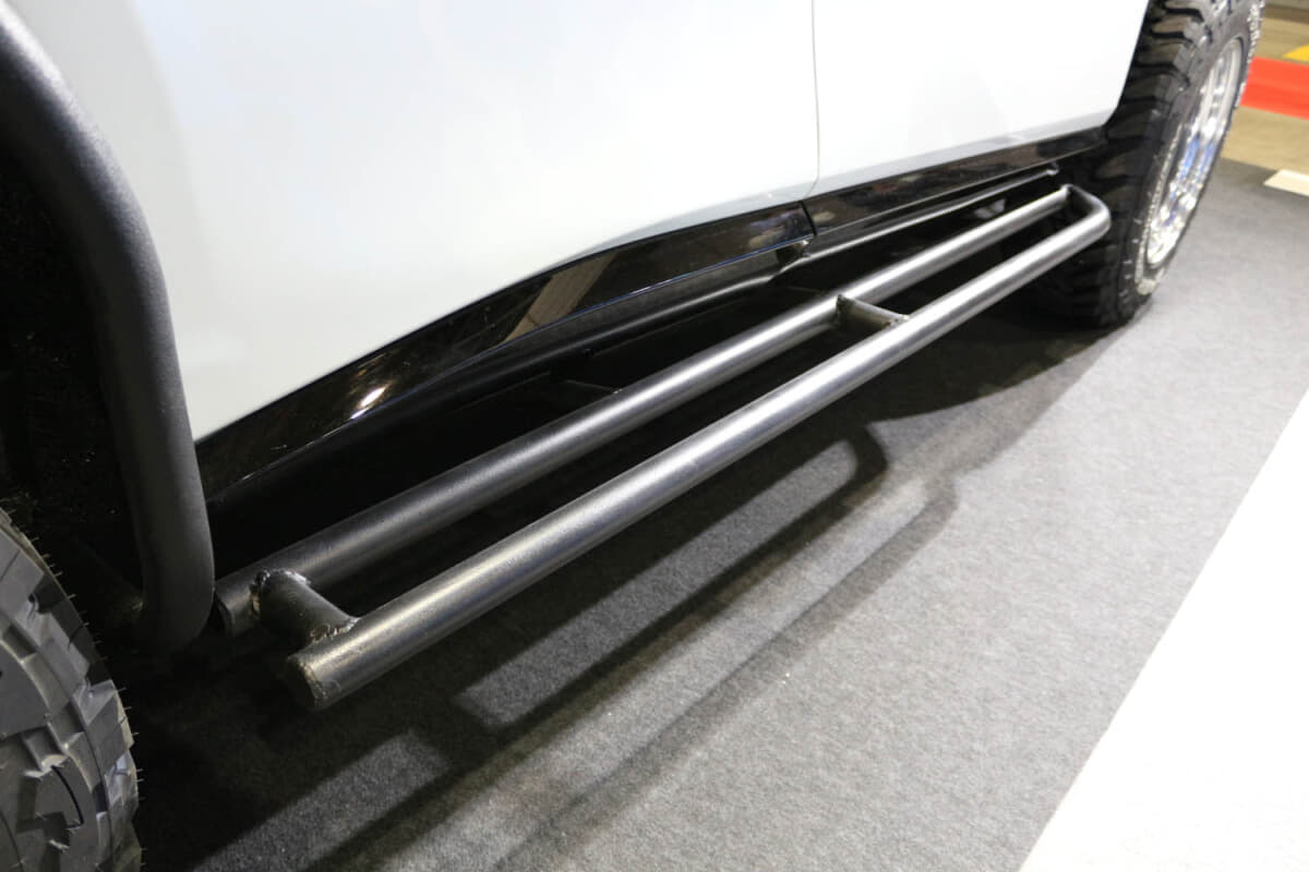 • 関東工業自動車大学校 日産 ARIA:ボディサイドにも自作したガードを装着。乗降時にステップの役割も果たしてくれる