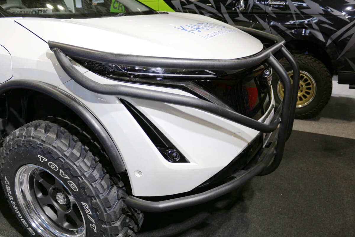「以前からSUVのクロスカントリー仕様に興味がありました。今回、日産 アリアをベースとしたカスタムカーを製作するにあたり、無骨さだけを追求するのではなくカッコよさをプラスし、バンパーガードを通じてオフローダーに丸みを持ち込んでみました」