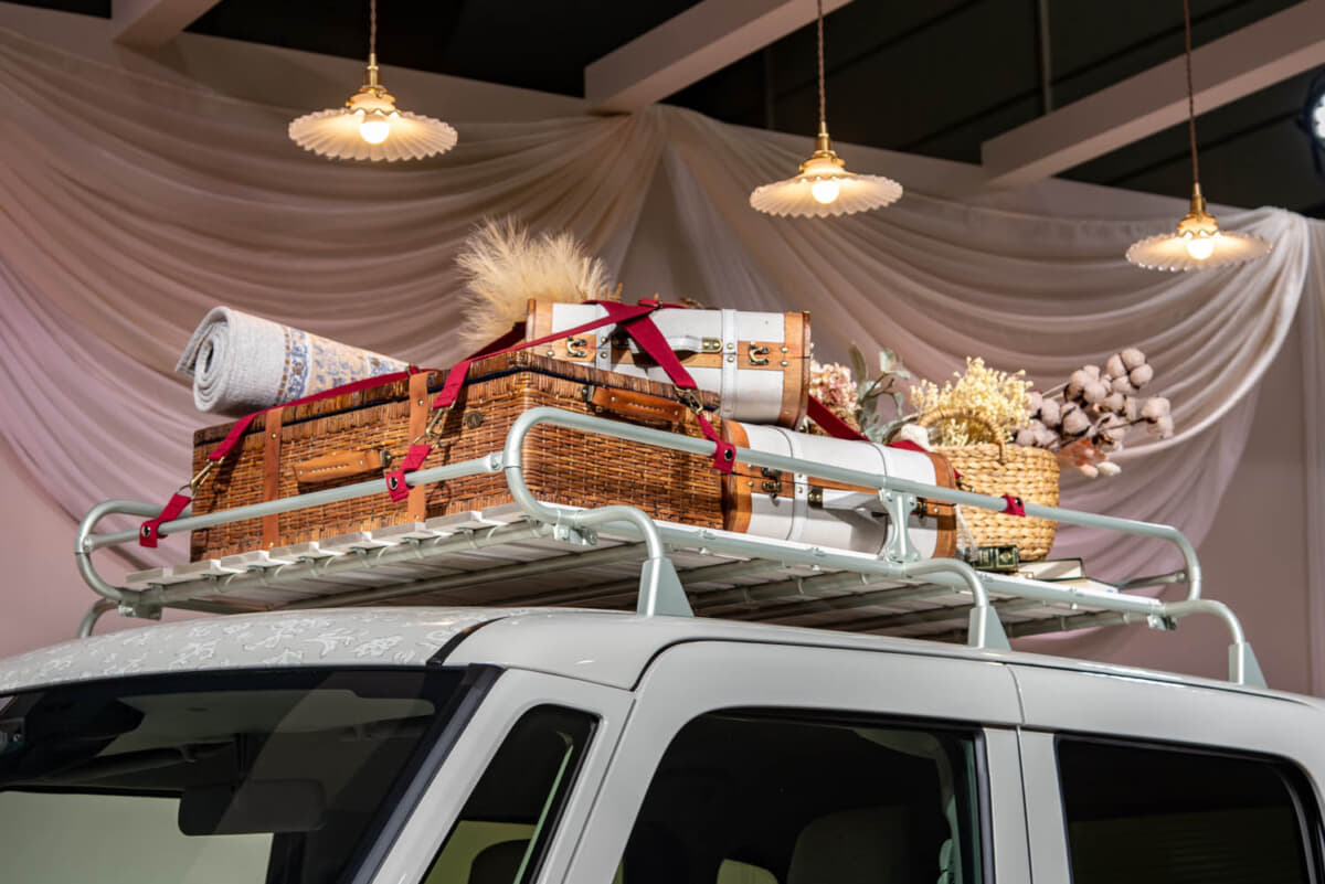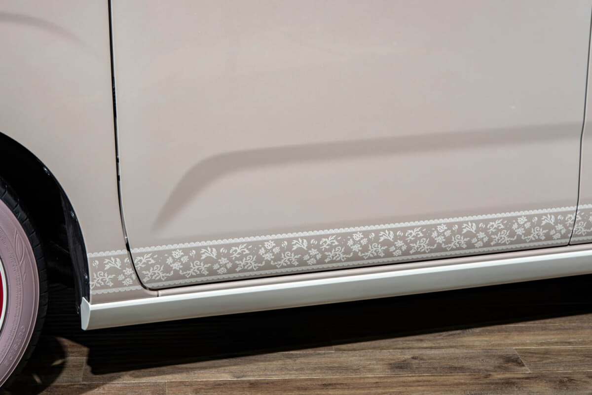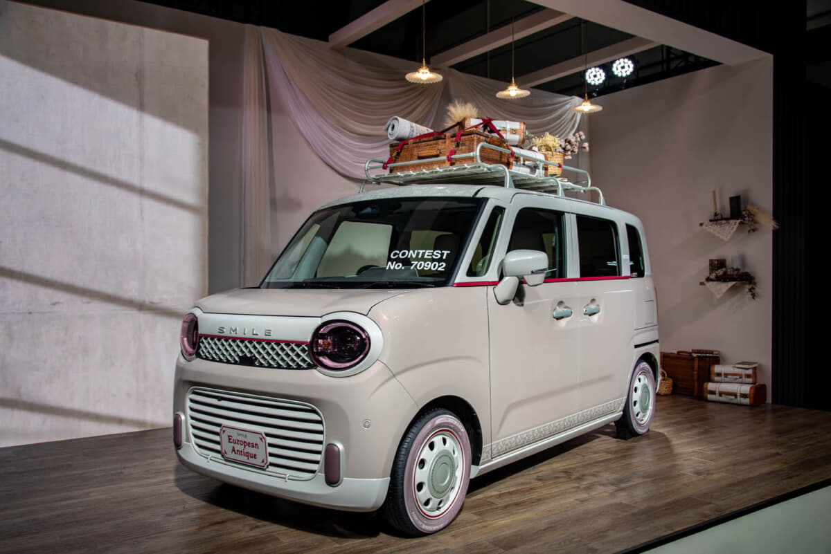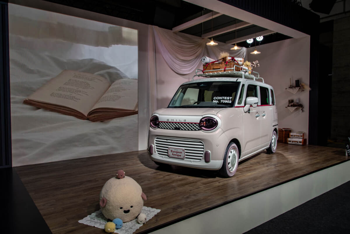 ワゴンRスマイルは「ヨーロピアンアンティーク」と名付けられたカスタマイズカー。誰が見ても「かわいい」と思うクルマを目指したとのことで、細部まで、かわいいにこだわっている。ヨーロピアンアンティークの名が表すように、レースやリボン、花柄などが各所にデザインされている。スズキいわく「かわいいをブーストさせた」とのことだ。