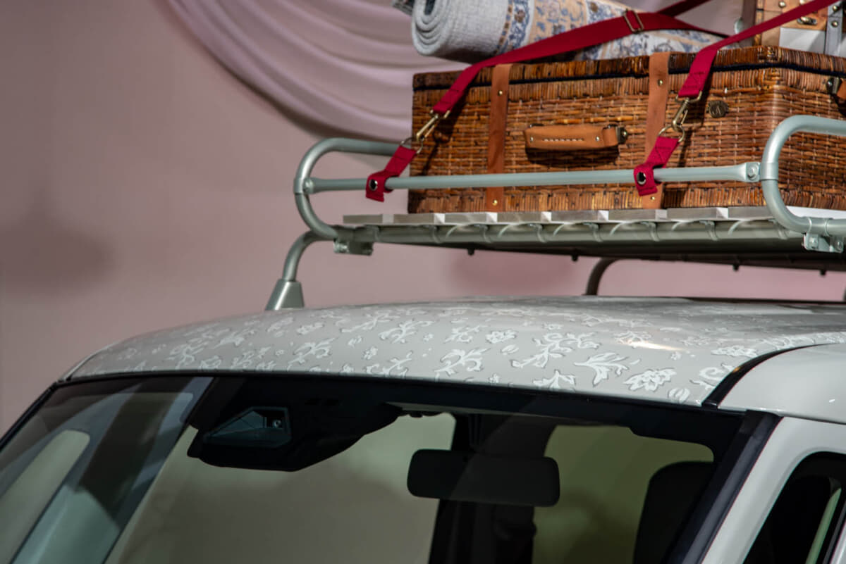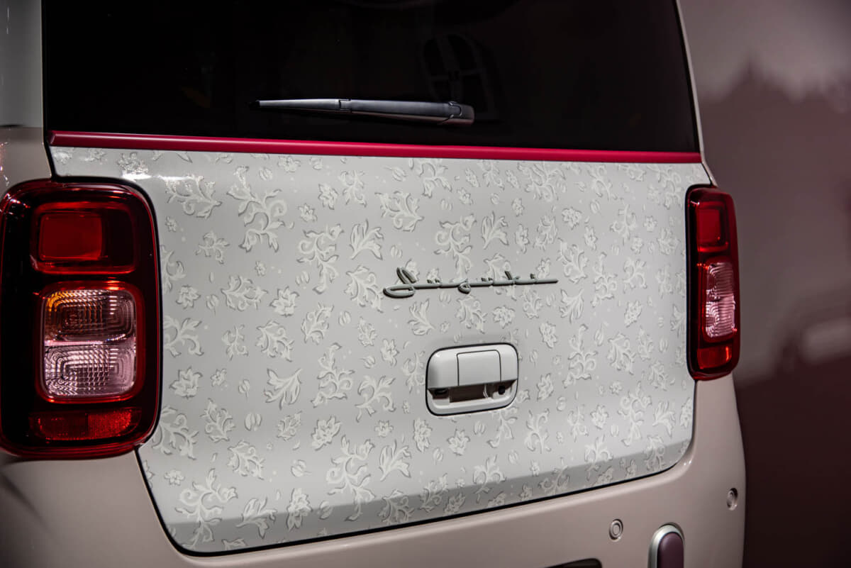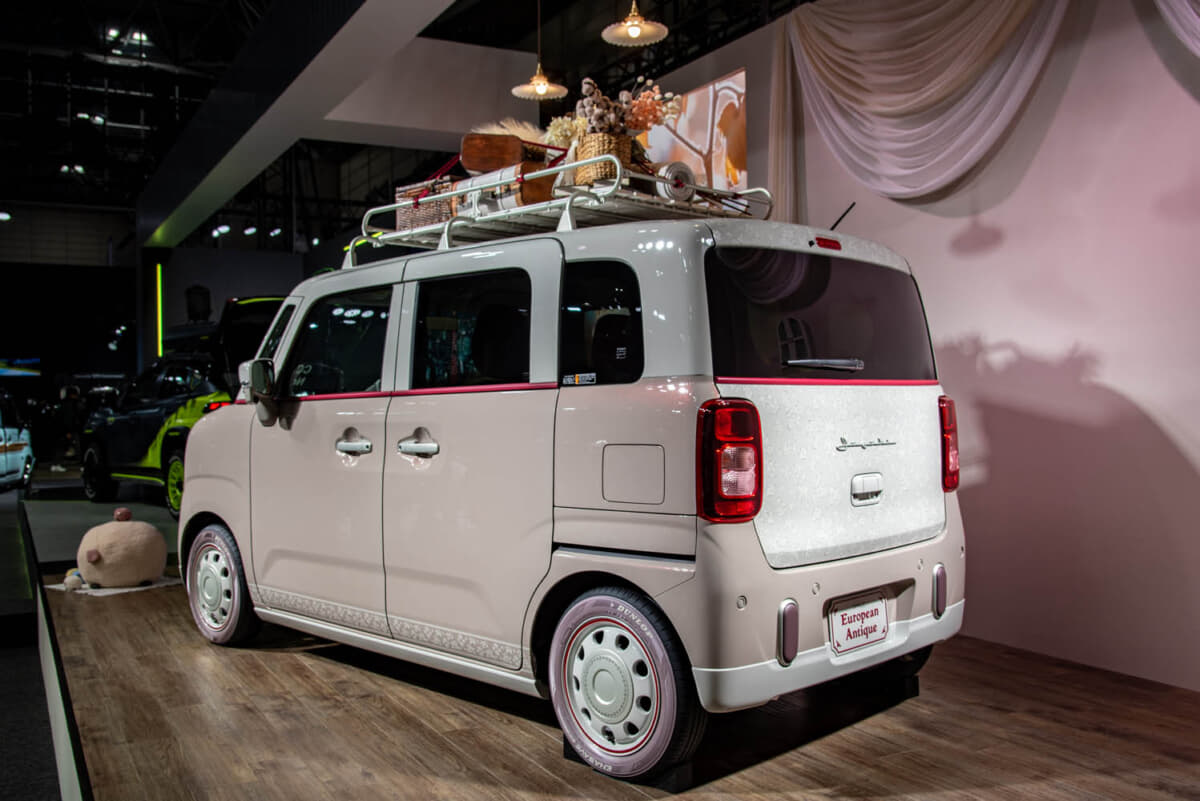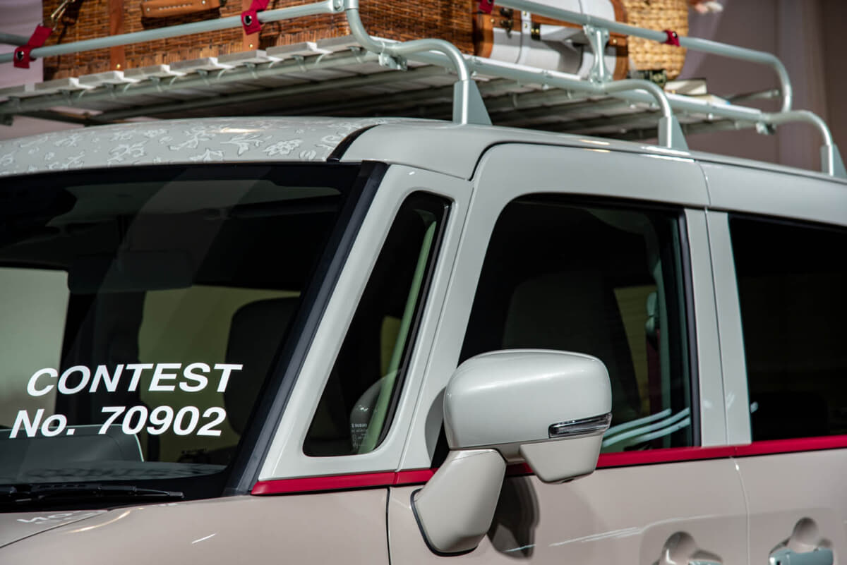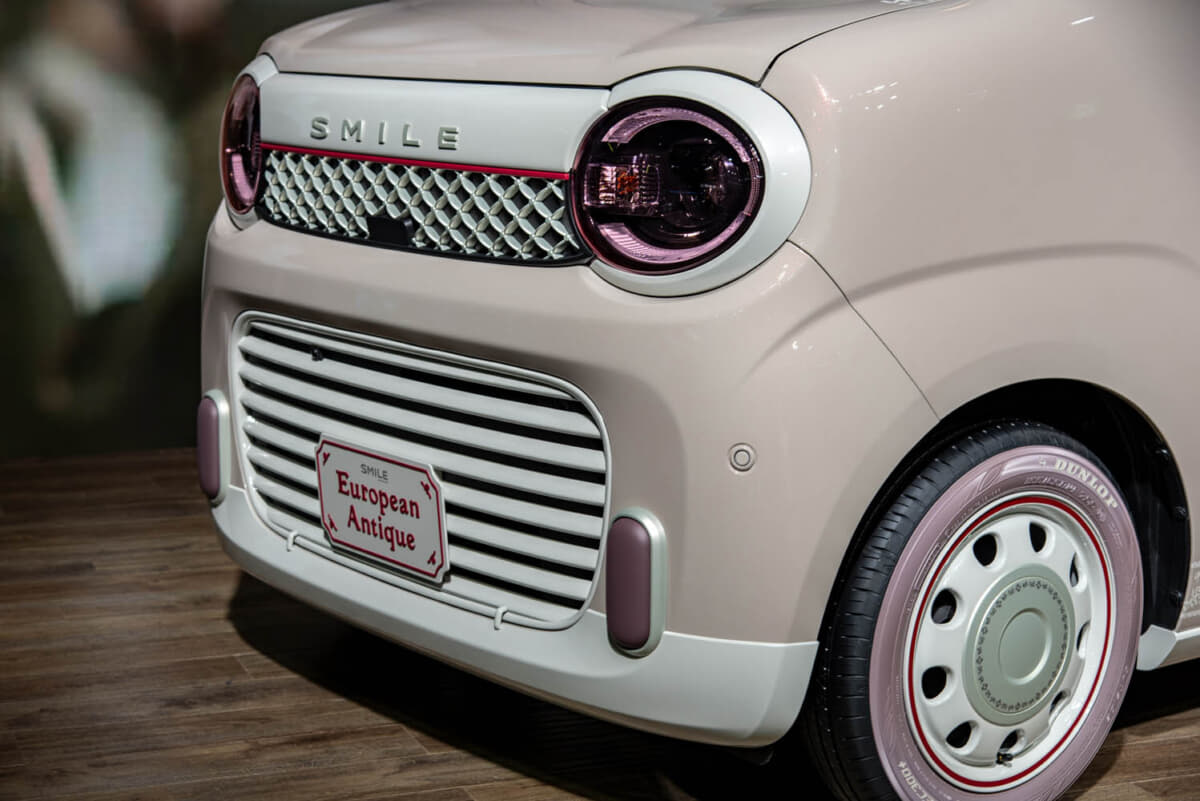 ワゴンRスマイルは「ヨーロピアンアンティーク」と名付けられたカスタマイズカー。誰が見ても「かわいい」と思うクルマを目指したとのことで、細部まで、かわいいにこだわっている。ヨーロピアンアンティークの名が表すように、レースやリボン、花柄などが各所にデザインされている。スズキいわく「かわいいをブーストさせた」とのことだ。