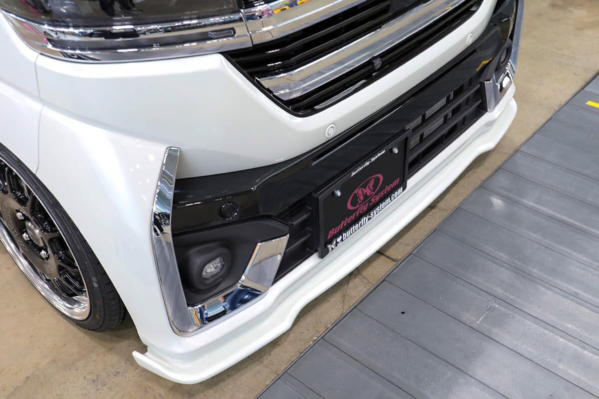 バタフライシステムが披露したスペーシアカスタム用イージーフラップは3点。フロント、サイド、リアの各部に装着するだけでスポーティ感があふれる、フラップ形状のデザインだ。フロントは、左右にさりげないカナードデザインを採用。フラップ本体の取り付け部を長めに設定することで、純正比約30mmのローダウン効果もあり。前方へのさりげない張り出し感、細部の立体感にもこだわっているため、純正バンパーとこのフラップを塗り分けして楽しむことも可能だ。