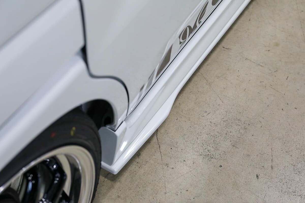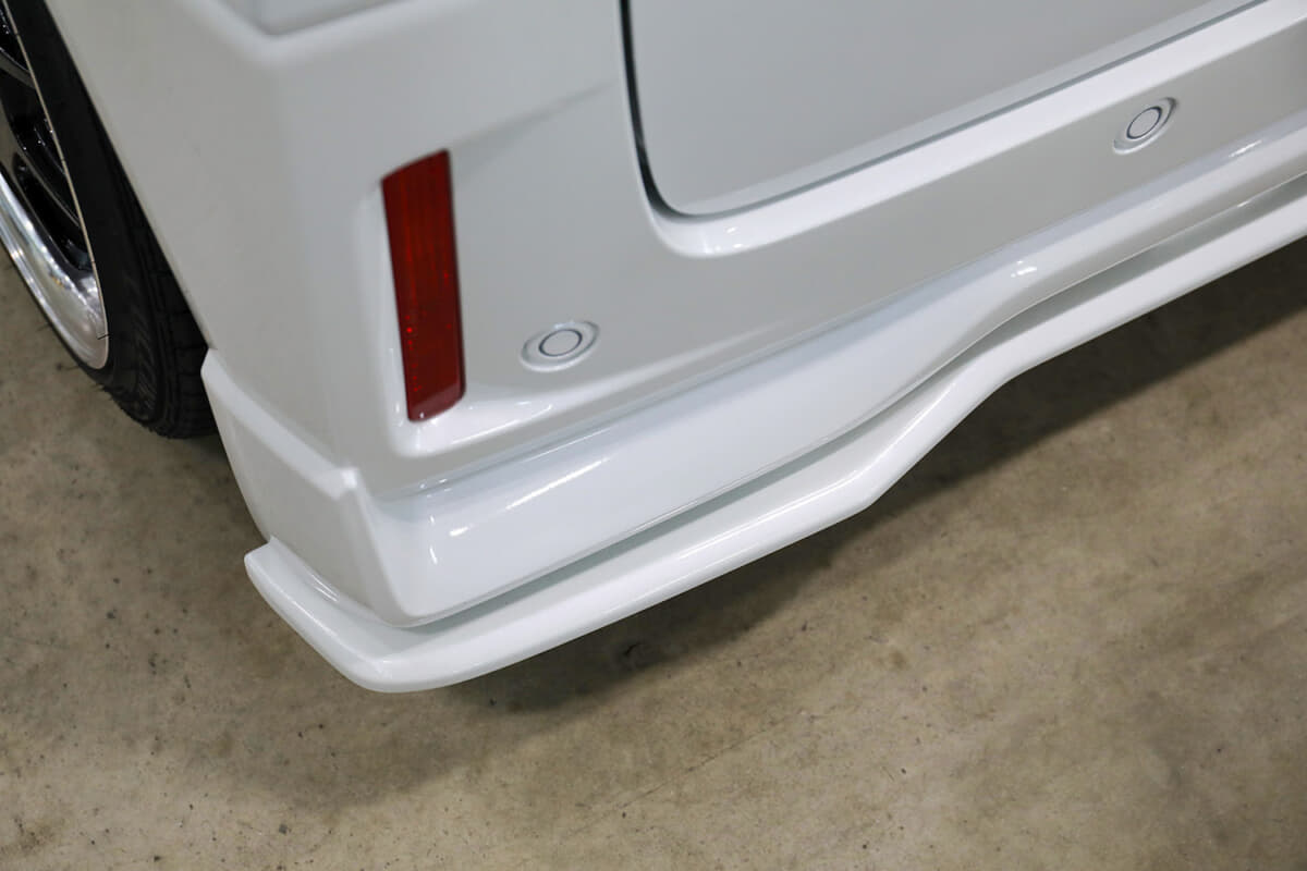 サイドは、製品の前後に張り出し感を追加したデザインが特徴。この横へのわずかな広がりが、クルマに適度なボリューム感を与えているのだ。リアも、フロント、サイドと同じようにボルト留めによるフラップタイプで仕上げている。
