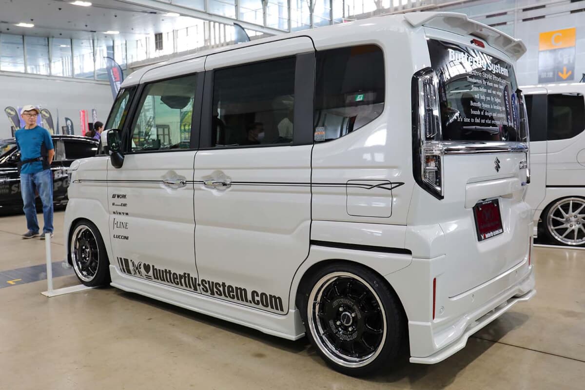 今回、バタフライシステムが用意した注目のクルマは、現行車となるスズキ3代目「スペーシアカスタム」。2008年から発売されたスズキの軽トールワゴン「パレット」がその源流にあたり、その後継車種として2013年に「スペーシア/スペーシアカスタム」が登場した。2017年には2代目が発売。さらに2018年には、SUV風スタイルの「スペーシアギア」が追加されたことで一躍大人気に。そして3代目となる現行車は2023年11月より発売され、スズキを代表する軽自動車の中の1車種だ。
