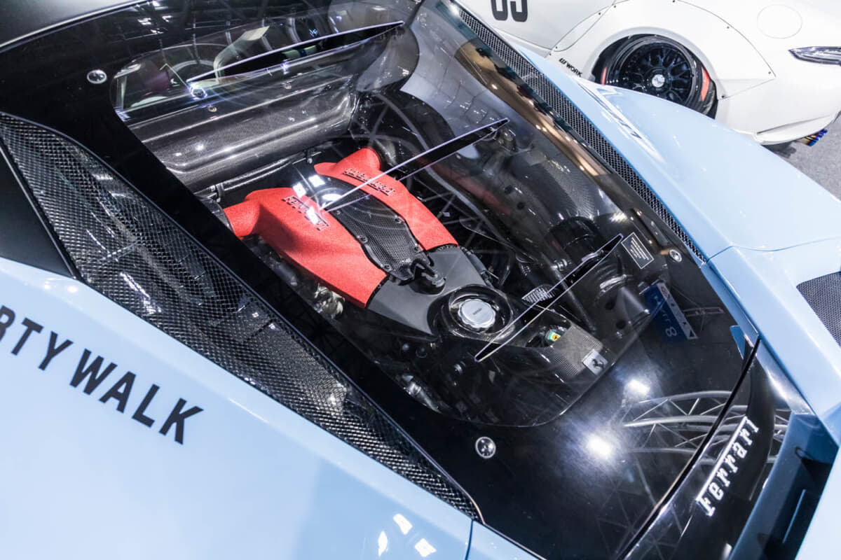 リバティーウォークというと、ここ最近は日本車だけにとどまらず外国車や旧車のカスタマイズも行なっており、その幅の広さも話題となっている。2025年のオートサロンでもランボルギーニ「ミウラ」のカスタムが披露され話題となったが、そんなブースの脇にはフェラーリ「F8トリブート」のコンプリートカーが展示されており、注目を集めていた。