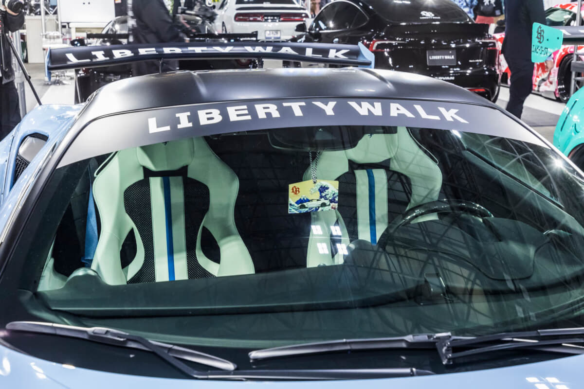 ルーフをブラックアウトしたライトブルーのボディにリバティーウォークの真骨頂であるオーバーフェンダーが装着されたスタイルが会場でも異彩を放っていた。