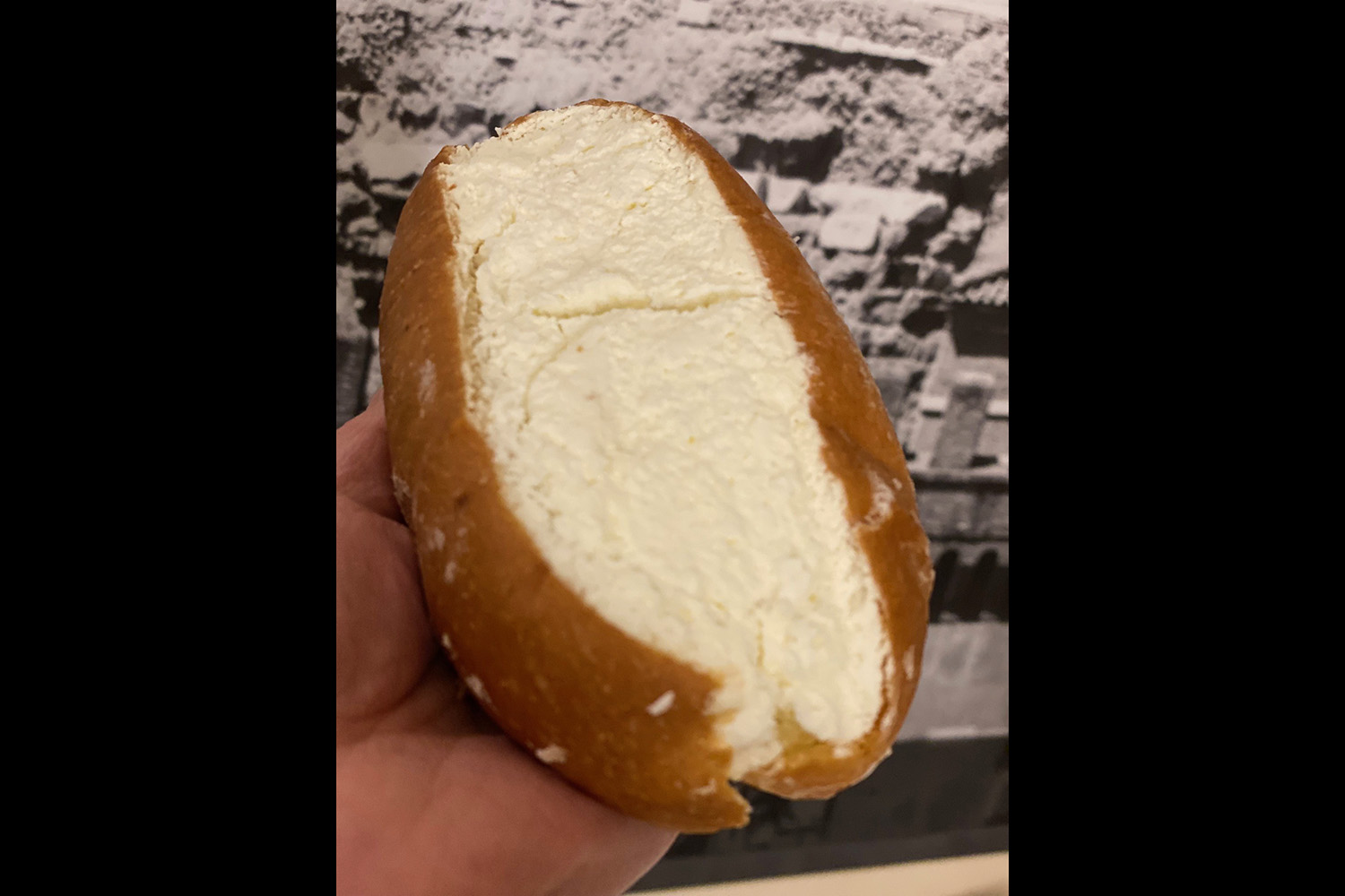 さて、駅の近くのお菓子屋さんで買ったマリトッツォは3ユーロ(約490円)。こんなもんかな? ちょっと高い? と思いながらも買ってみました。見た目はどっしりですが、驚くほど軽かったです。