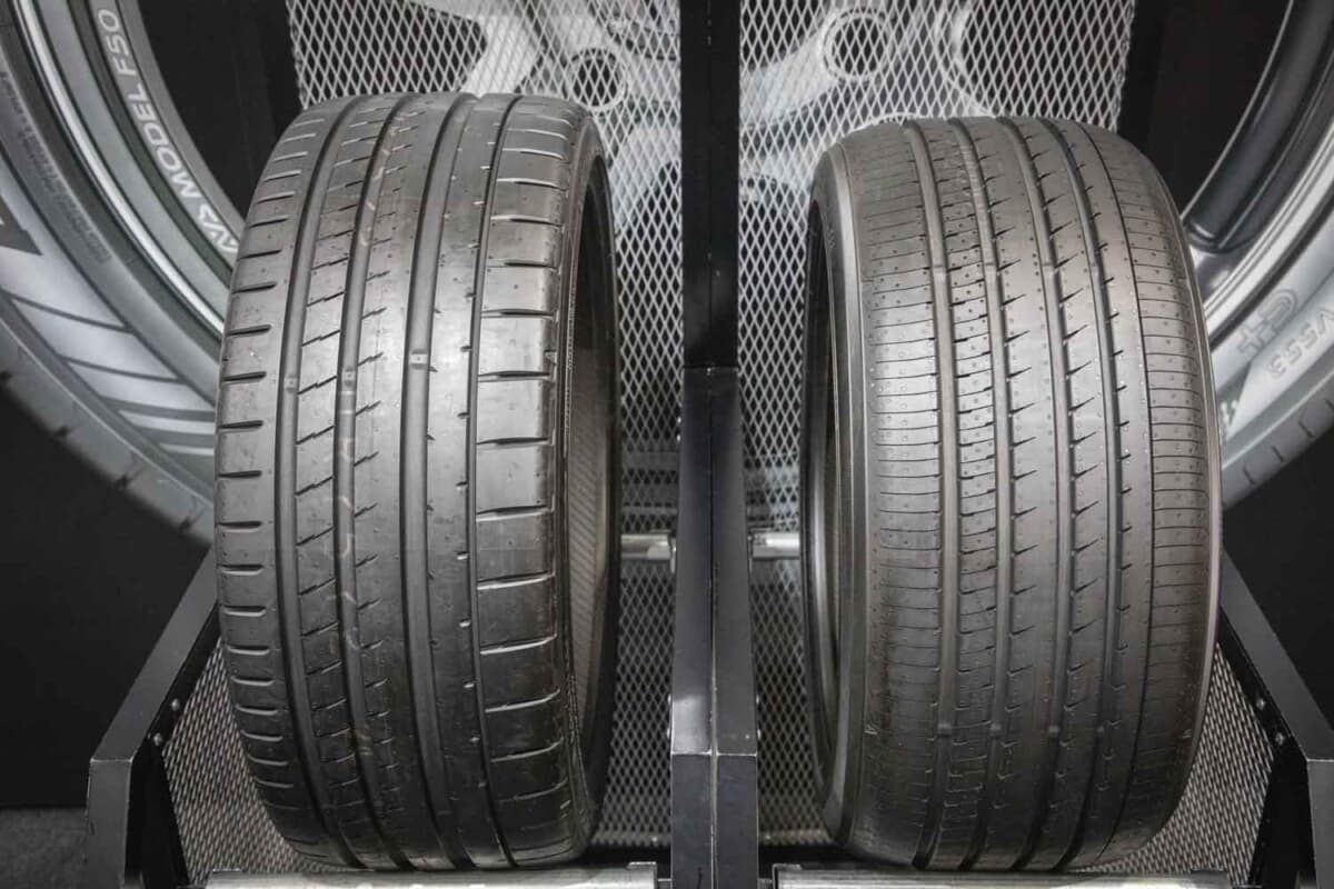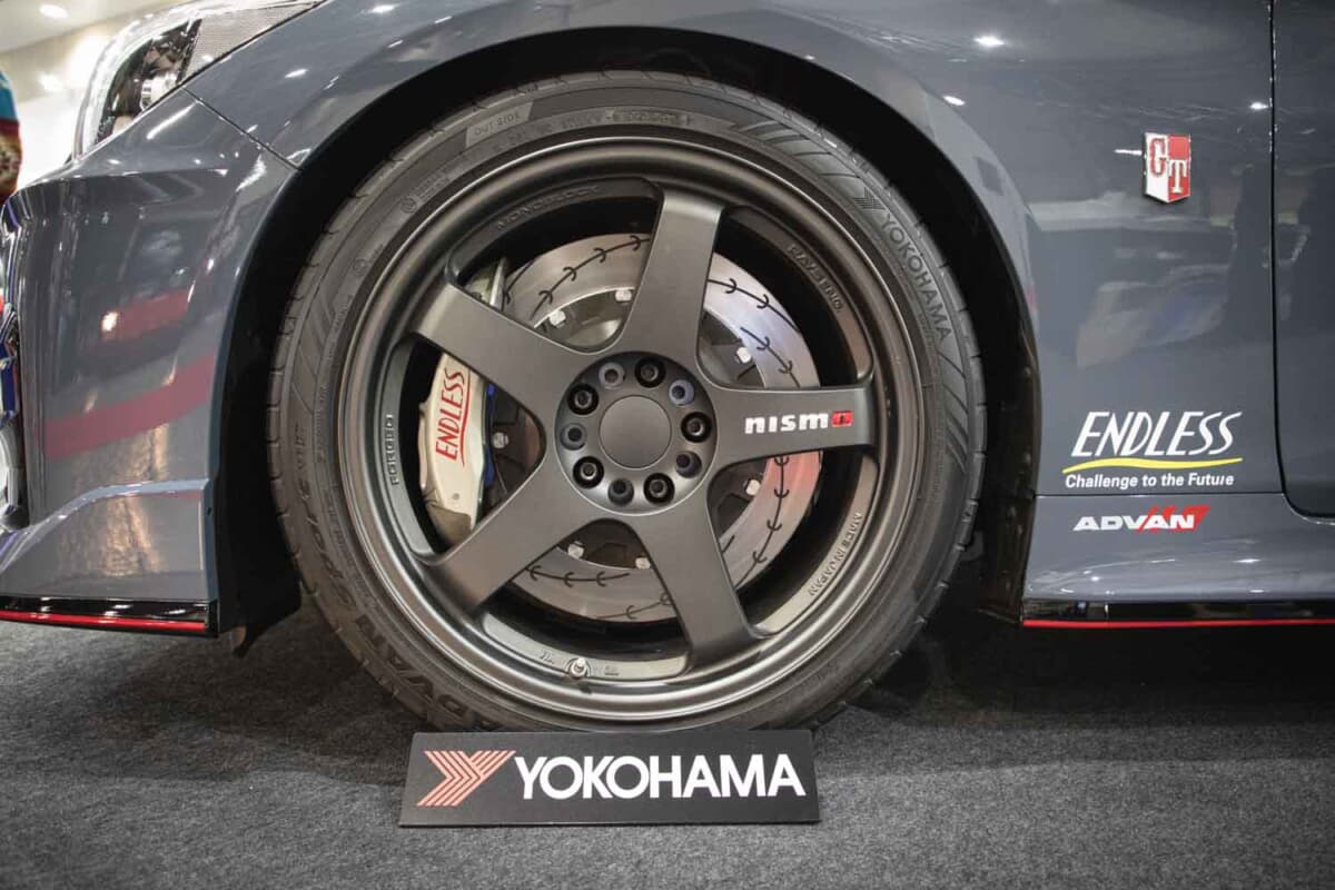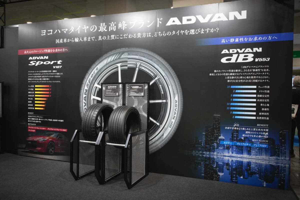 大阪オートメッセ2025で横浜ゴムは、グローバルフラッグシップタイヤ「ADVAN Sport V107」と新製品「ADVAN dB V553」の2種類を主軸に展開していた。