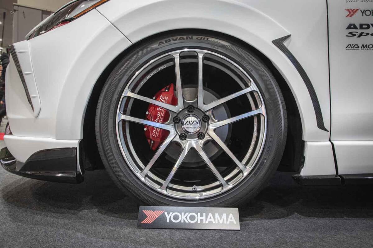 V107は、スーパーGTドライバーの松田次生選手の愛車である日産「スカイライン NISMO」と、ARTISAN SPIRITSのフルエアロを装備したトヨタ「ハリアー」に装着し展示。ハリアーは、右側にADVAN Sport V107、左側にADVAN dB V553を履かせるという見せ方をしており、静粛性の高いコンフォートタイヤを求める人にはV553、スポーティな走りを楽しむ人にはV107と、どちらも選べることを視覚的にアピールした。