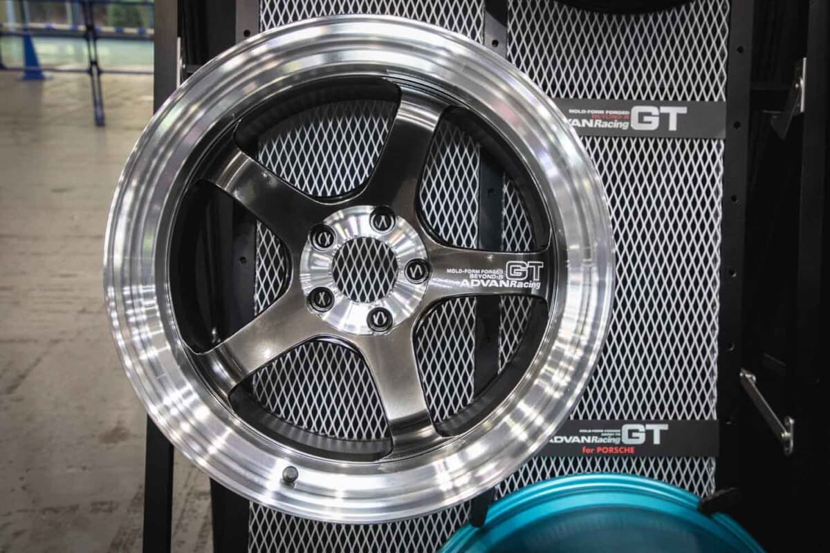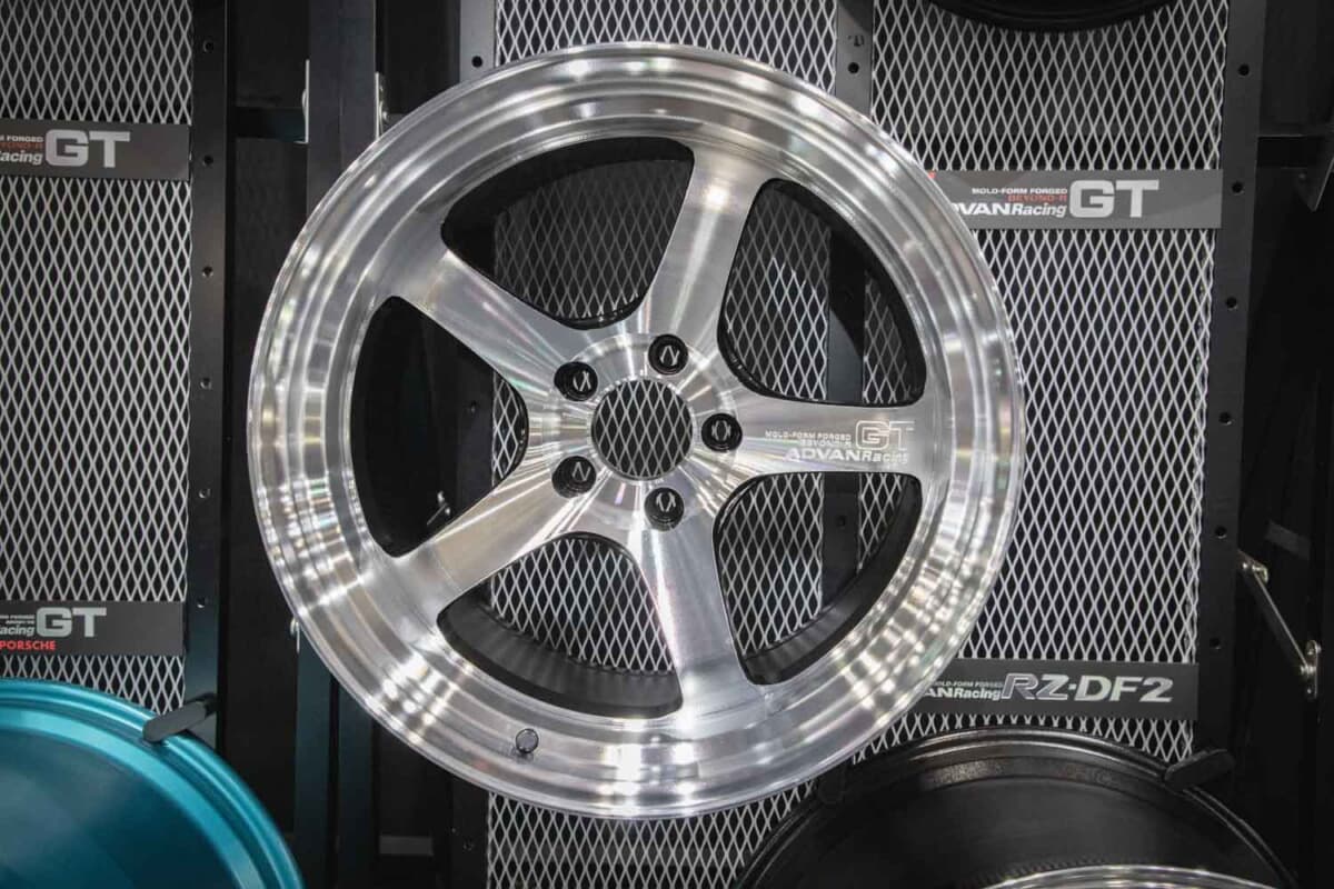 「ADVAN Racing GT BEYOND-R」は、大型化するブレーキシステムに対応したバレルリム形状となっており、新たに段付きリムにしたことで、GT BEYONDのコンケイブをさらに際立たせている。表面の輝きも塗装ではなく、切削になっているので光り方が違うのも特徴的だ。