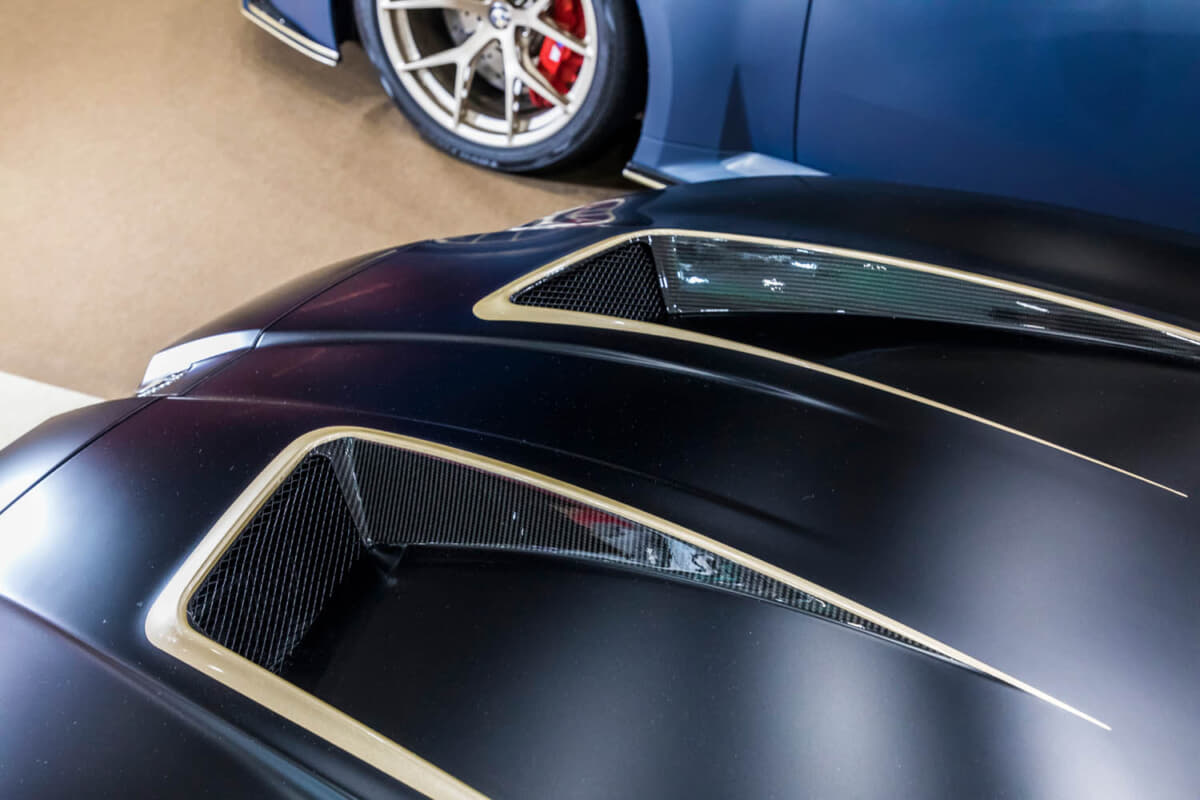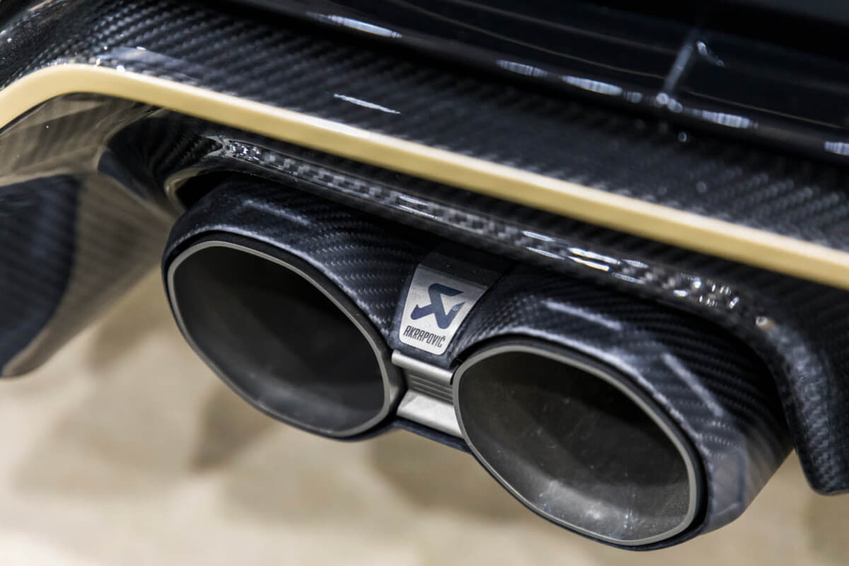 足まわりはKWのV3に、ホイールはBBS FI-R EVO シトリンゴールドで、フロント19×9.5J+15、リア20×10.5J+15という純正と同じ前後異径のセットアップで、それぞれ275/35R19、285/30R20サイズのTOYO PROXES Sport2タイヤを組み合わせている。