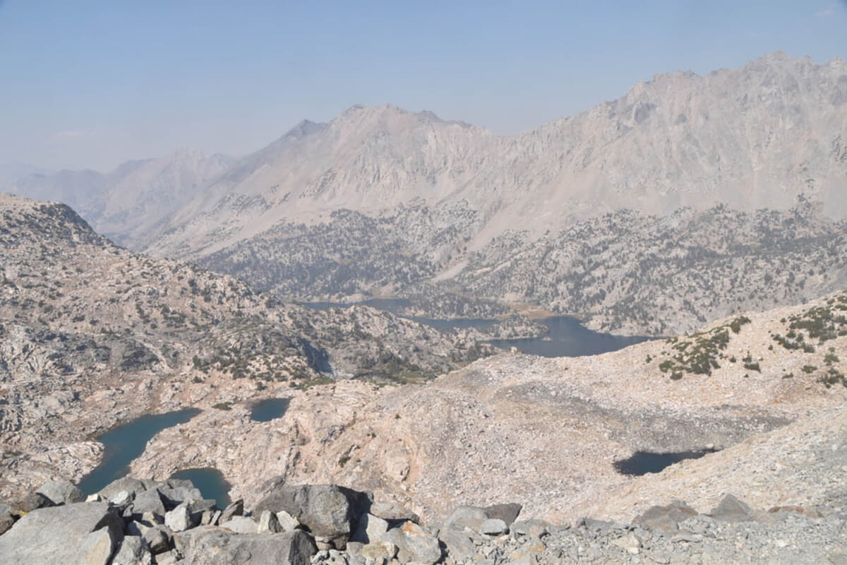 翌日には、当初の目標であったグレンパス(グレン峠)にアタック。なんとか登り切って、眼下にRae Lakesを見下ろすことができた。ところが、ヨセミテの方向で山火事が起きているそうで、残念ながら視界は煙っていた。これもまた大自然だ。