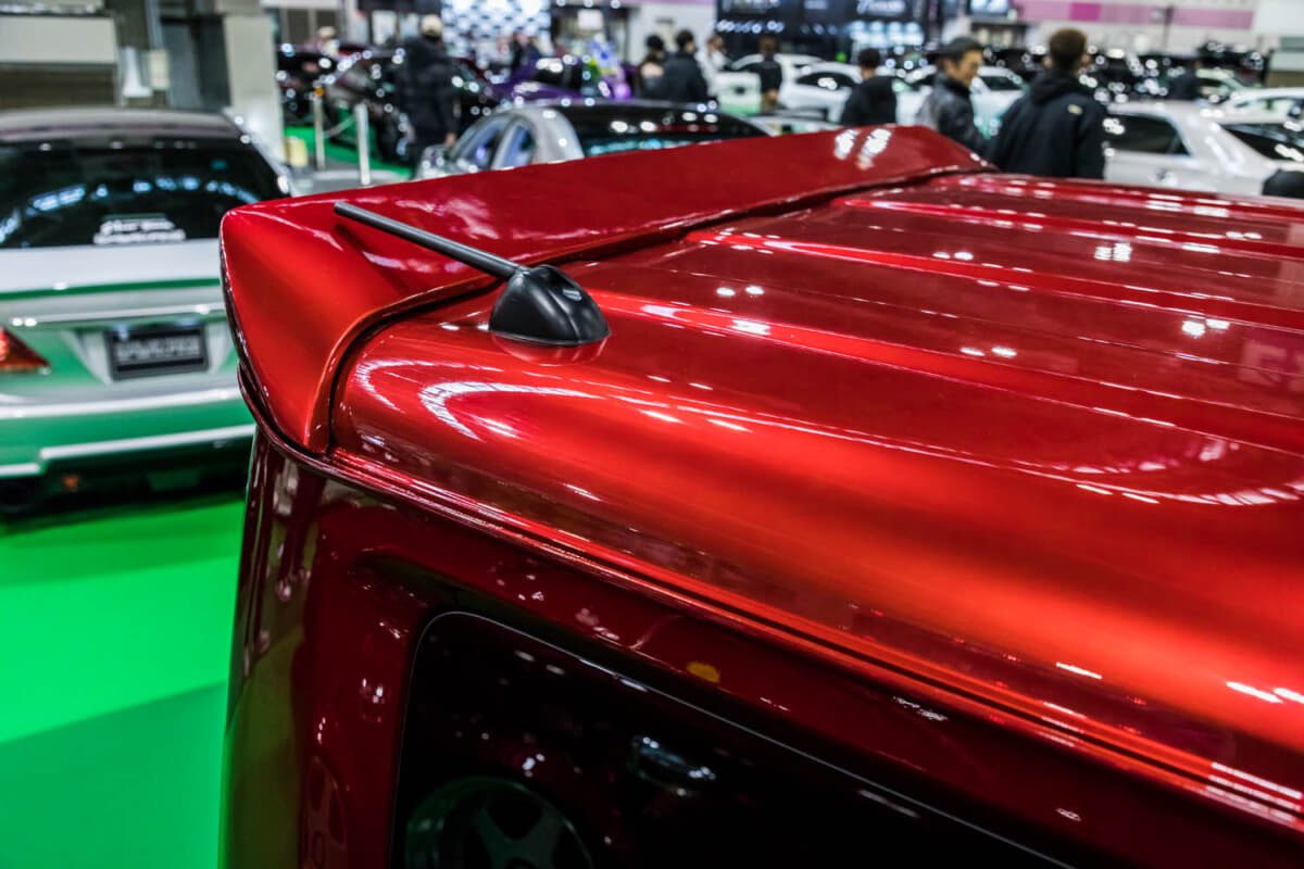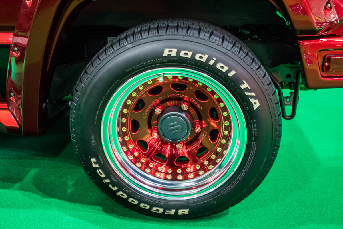 会場内を歩いていると、K-BREAKのブースにJIMRIDEブランドで展示されていた変わったスズキ「ジムニーシエラ」のカスタム車を発見。通常であればリフトアップし、直径の大きなタイヤを装着するオフロードカスタムが主流のなか、あえて車高を下げ、タイヤ直径の小さい扁平タイヤを装着。さらにメッキバンパーを装着し、ボディカラーも鮮やかなキャンディレッドとなっているのだ。早速スタッフにお話を伺ってみた。