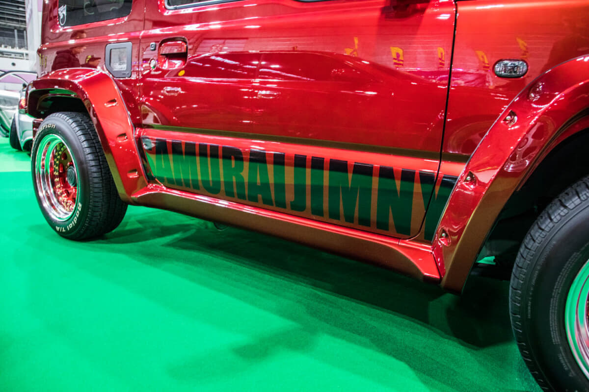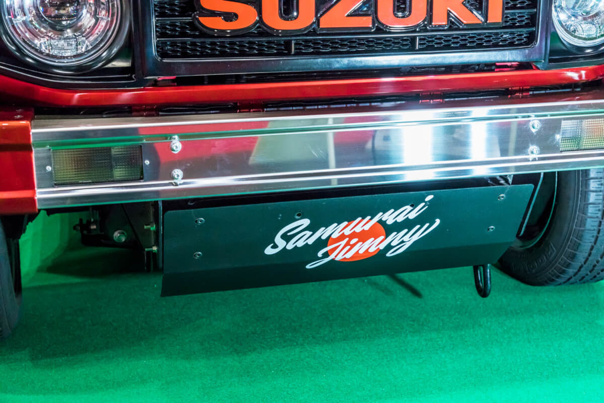 オフロード用の巨大なオーバーフェンダーを装着し、当時っぽいキャンディレッドで塗装されたボディの側面には、シャドーストライプ風に「SAMURAI JIMNY」のロゴが入る。またフロントグリルには巨大なSUZUKIスクリプトをボディ同色にコーディネートして装着。