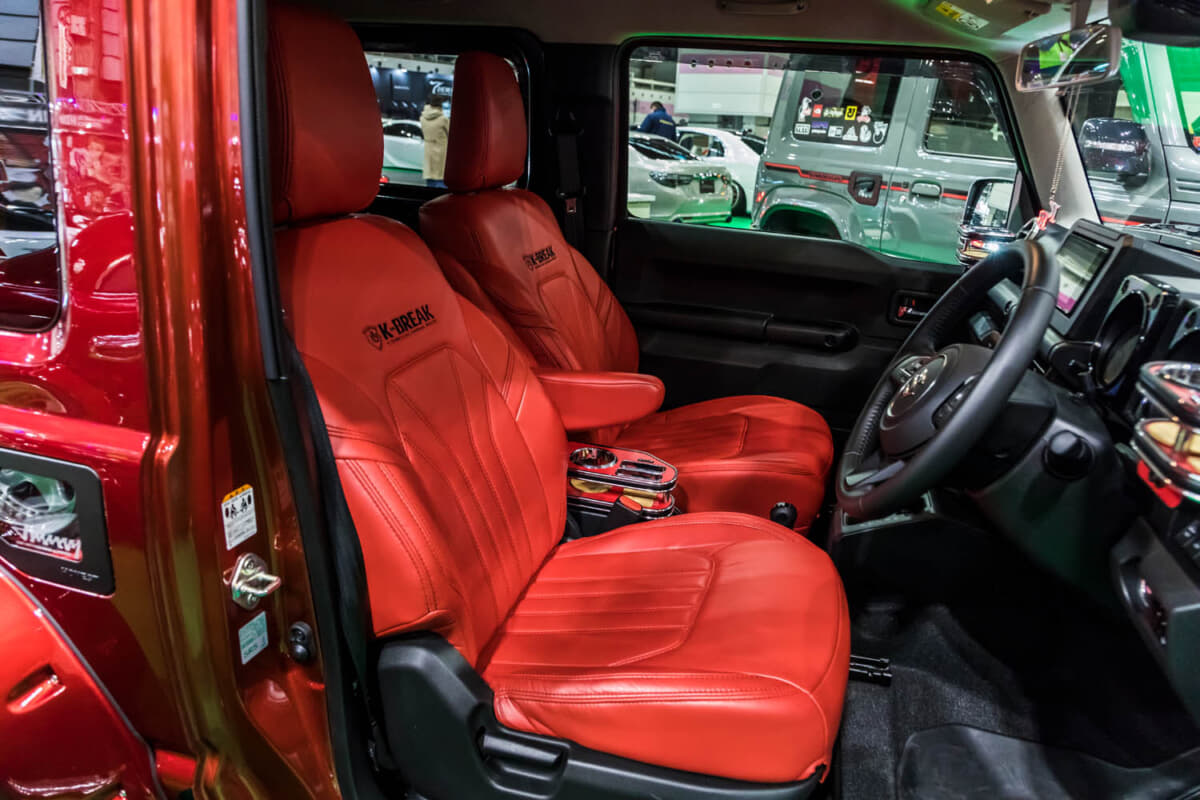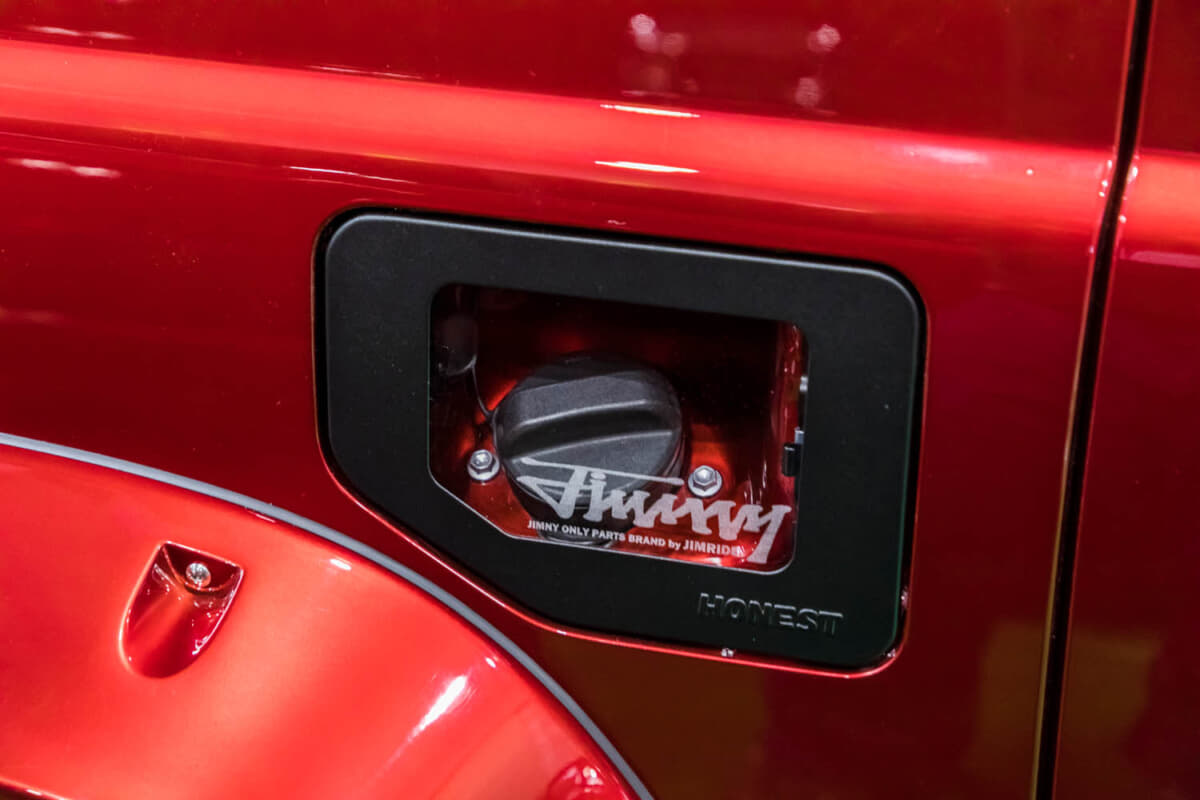 もちろん内装もJIMRIDEのシートカバーキットを使用して真っ赤にコーディネート。これまでのジムニーカスタムの常識を破り捨てた、新しい発想の1台となったのだ。