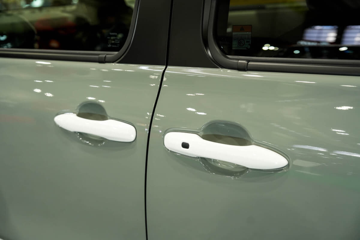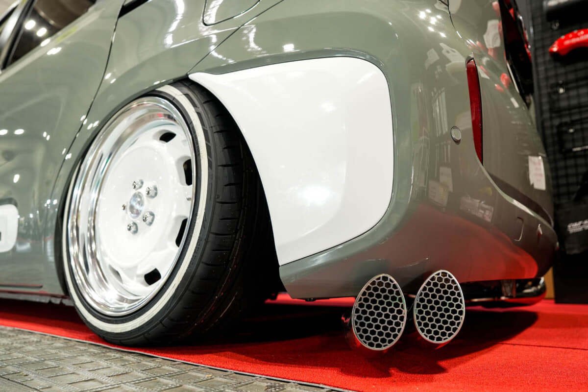 では車両の詳細を改めて紹介する。テーマは「アウトドア×かわいい×ローダウン」で、まずはダイハツの「ムーヴ キャンバス」をイメージし、ルーフやバンパーの一部などを白でラッピングした。あえてエアロパーツを装着しないのはアウトドアの印象をスポイルしないことだけが理由ではなく、ユーザーが同じ仕様を作ったりコンプリートカーとして販売する際の費用を抑えることも目的。
