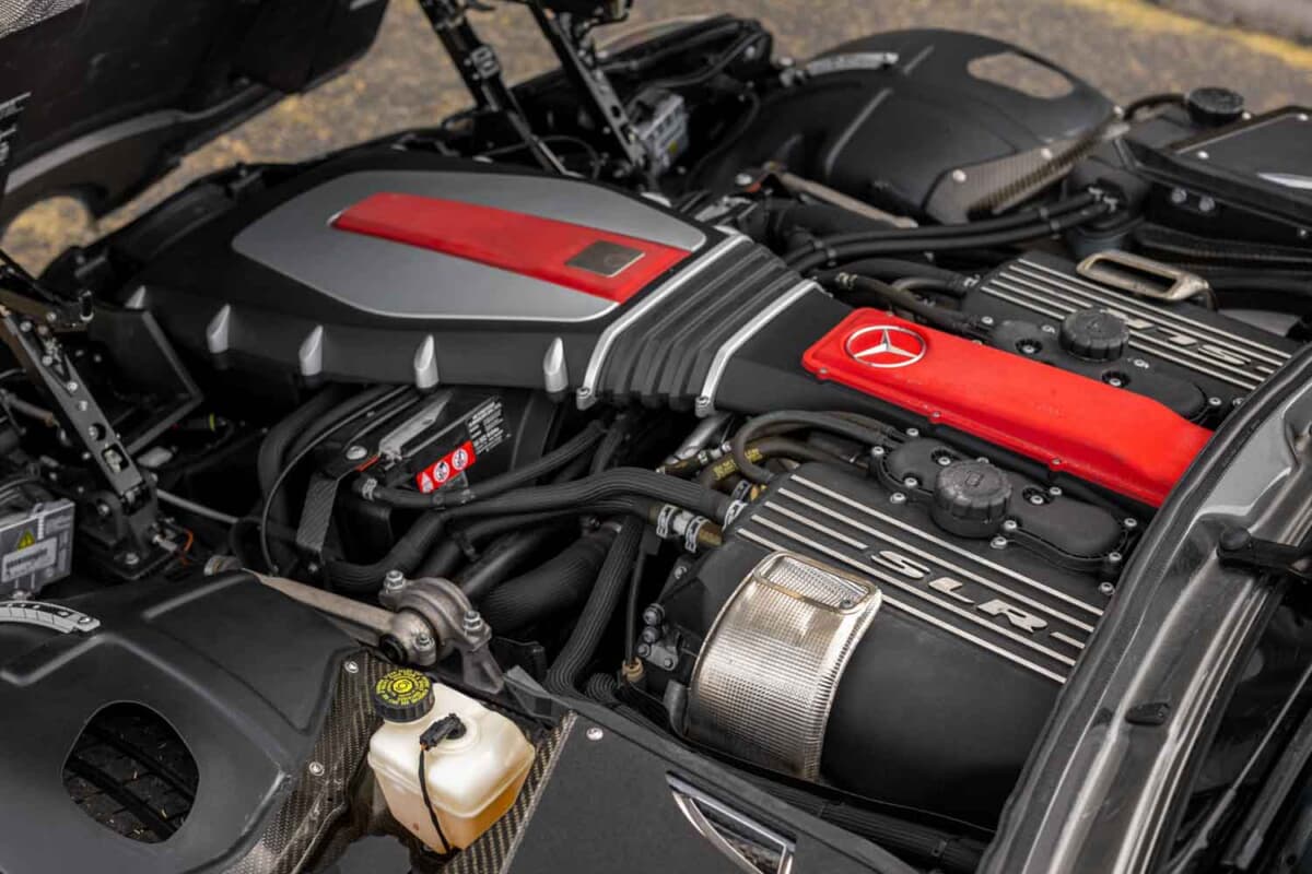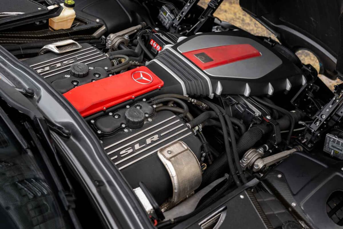 だがヴィジョンという言葉がリアリティに変わったSLRは、多くの者が想像していたとおり、じつに魅力的なスーパースポーツに仕上げられていた。個性的なロングノーズデザインの最先端には、F1マシンのノーズコーンにモチーフを得たデザインが採用され、フロントフェンダーに備わるエアアウトレット、あるいはその下に導かれるエグゾーストシステムのエンドパイプは、1955年に誕生したあの「300SLR」を彷彿させるものだった。