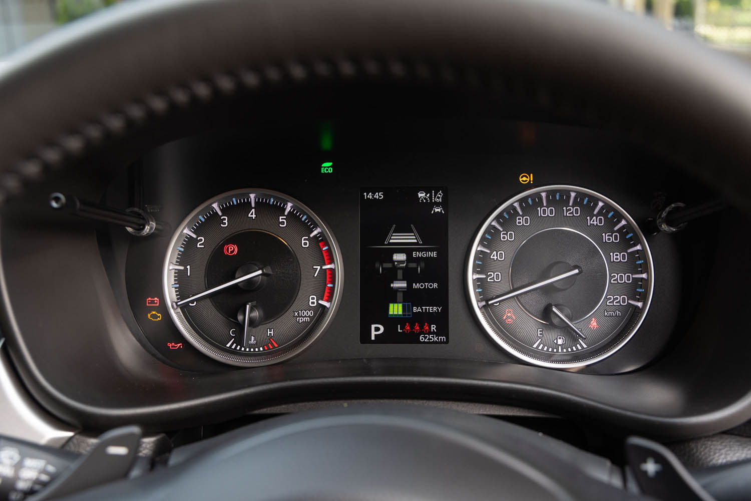 メーター内で表示できる駆動状況とバッテリー残量を示すグラフィックでは、バッテリー残量を5セグメントに分けているが、下から2つまではモーター駆動は一切行なわなくなる。そもそもバッテリー容量が少ないので、回生時間が短い市街地走行などではモーターのアシストはすぐに無い状況になる。