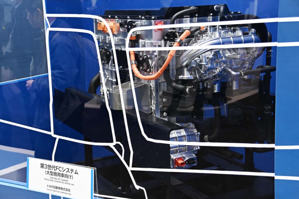 • 第3世代FCシステム:アクリル板の向こう側に展示となったトヨタの大型商用車向けモデルについては、メンテナンスフリーと、その耐久性を謳っている