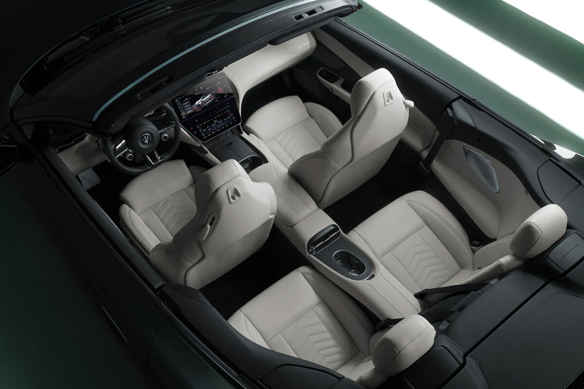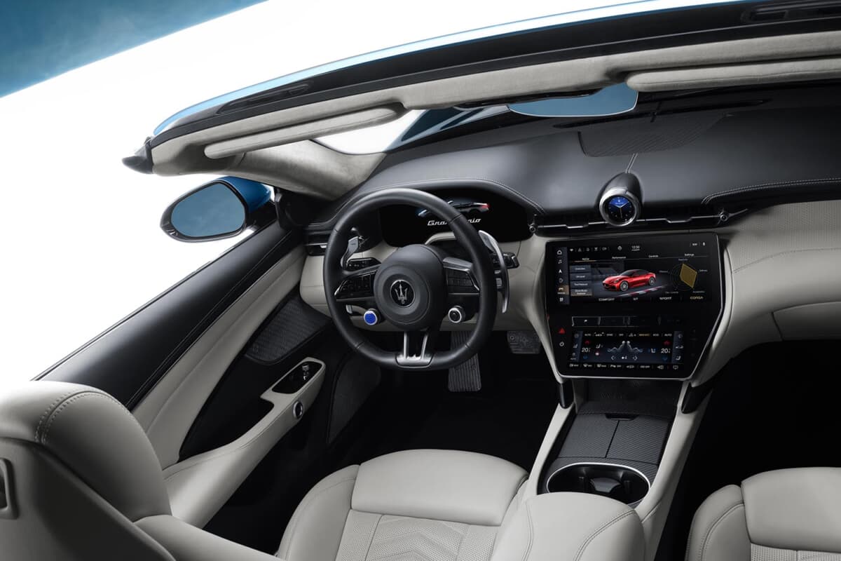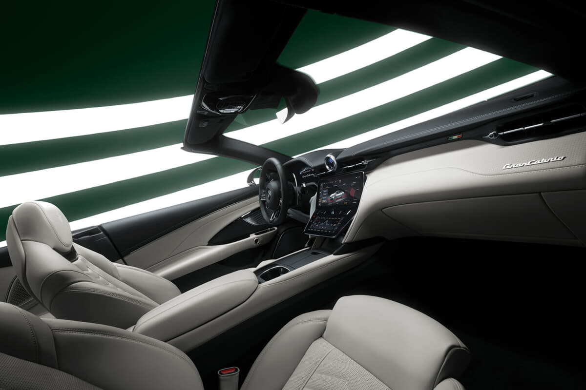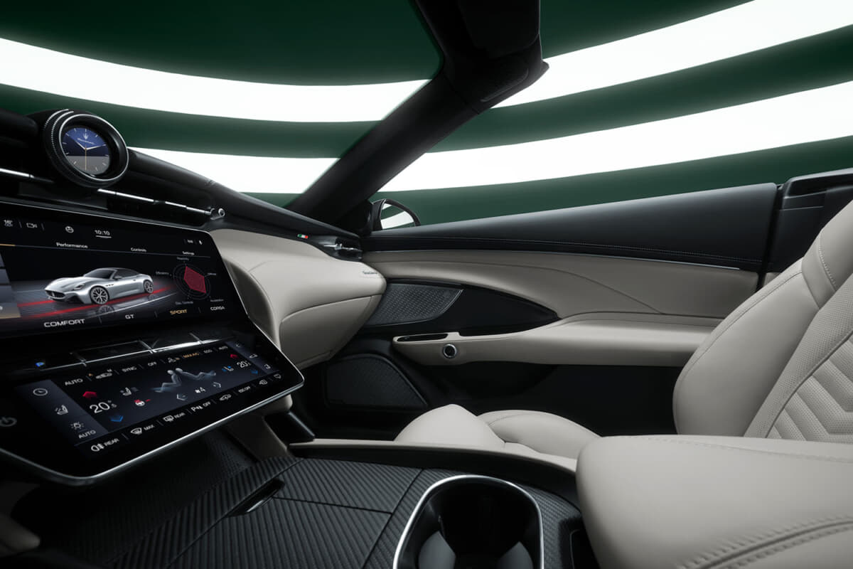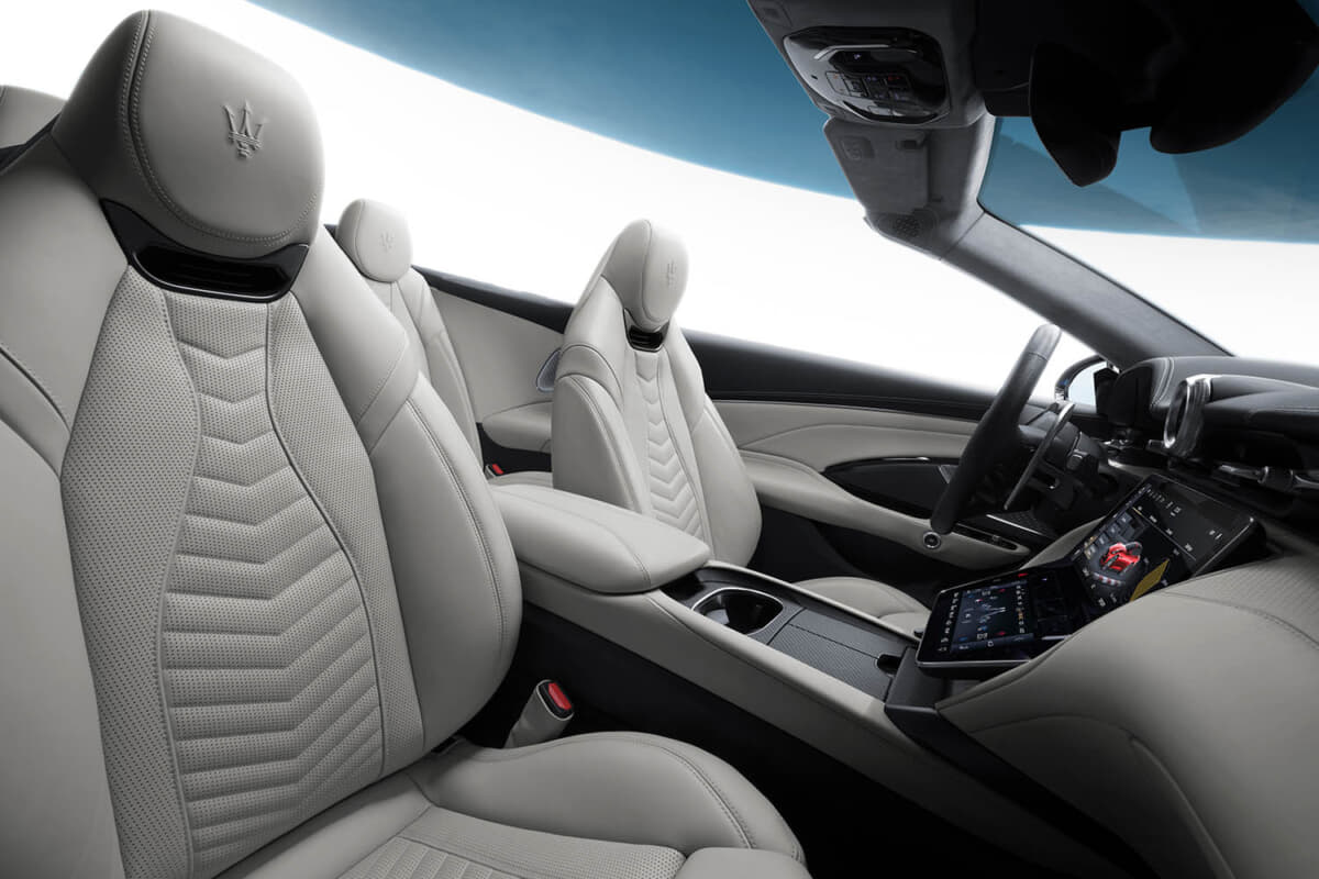 インテリアは氷をイメージしたアイスカラーのパンチング加工されたフルグレインレザーを使用し、ヘッドレストにはマセラティのトライデントロゴが刺繍されている。さらに、ソナス・ファベールのハイプレミアムサウンドシステムは3Dカーボンファイバー仕上げで、ダーク仕上げのアダプティブフルLEDヘッドライトなどを装備している。