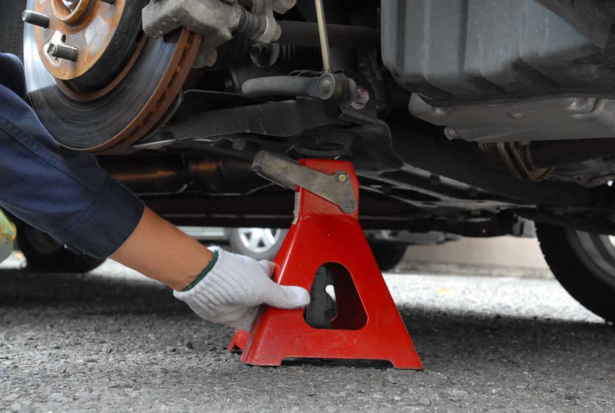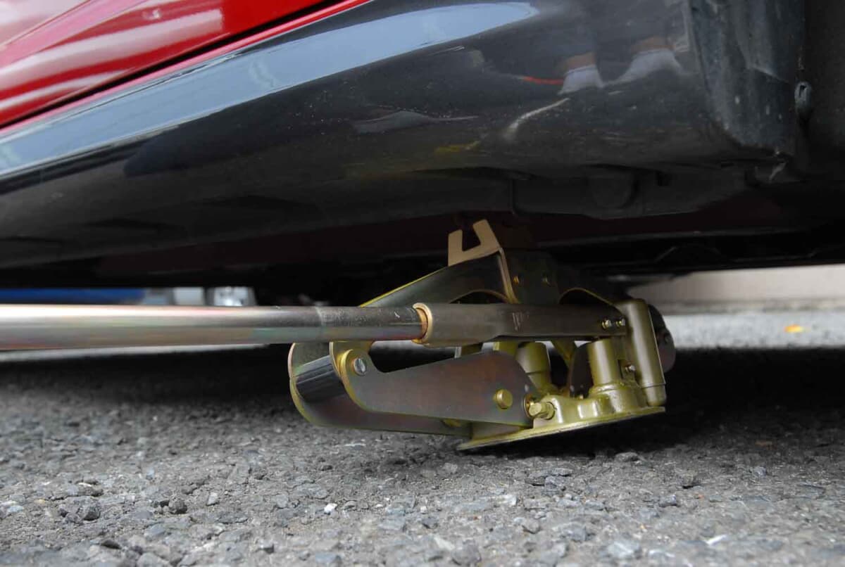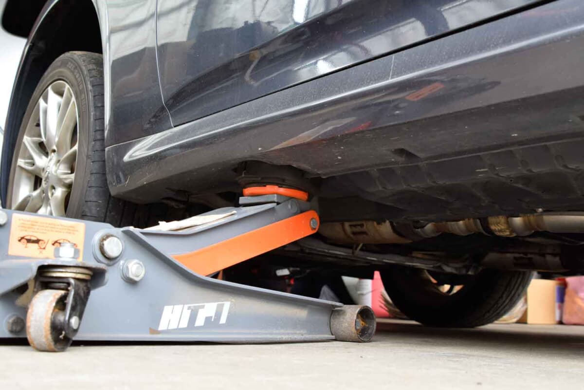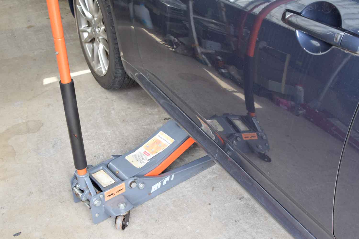 続いていよいよジャッキアップに入るが、先にジャッキをかける場所を調べておこう。多くはボディ下部のタイヤから遠くないところで、フレームに切り込みが入ったポイントがある。もし判断が難しければ取扱説明書を読むか、無理せずプロの手に委ねたほうがいい。