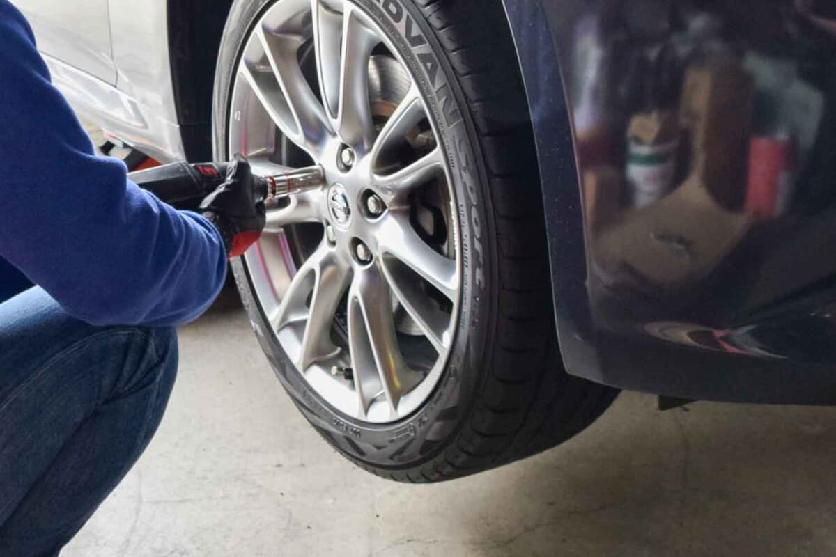 ジャッキアップする場所が分かったら慎重に車体を持ち上げて、タイヤが完全に浮いたら再びレンチでナットを回して取り外す。なお極端に高く上げる必要はなく、地面から少し離れた程度で十分だ。
