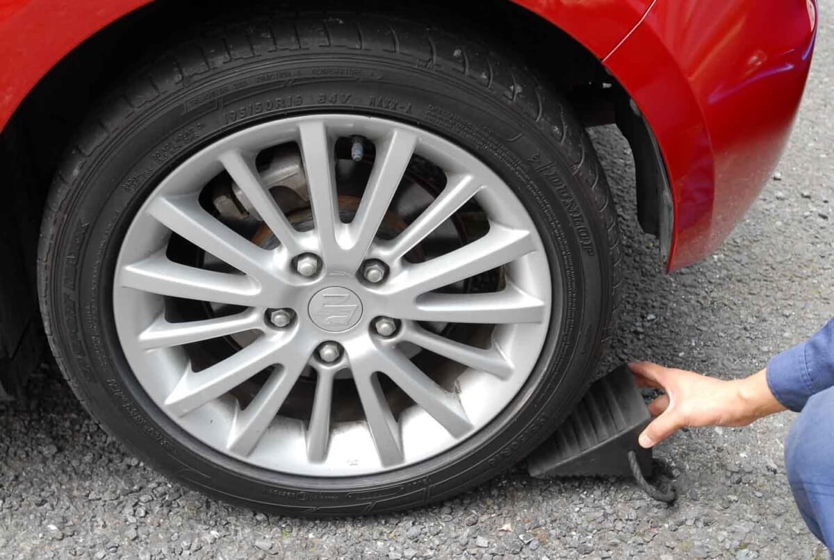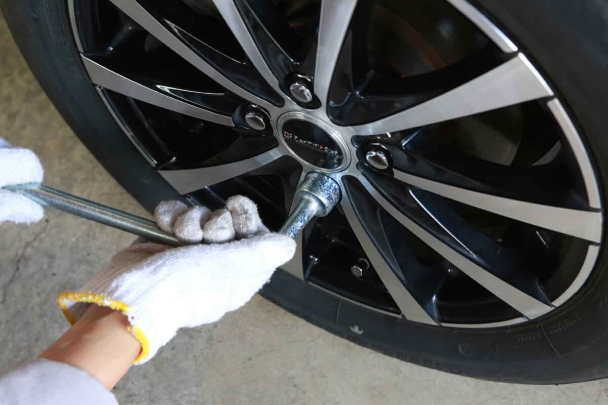 場所が決まったらクルマが動かないようサイドブレーキを引き、交換するタイヤの対角線上にあるタイヤを輪止めで固定する。次に車載もしくはカー用品店などで売っている十字型のクロスレンチを使い、4本すべてのホイールナットを緩め、ホイールキャップがある場合は外しておく。
