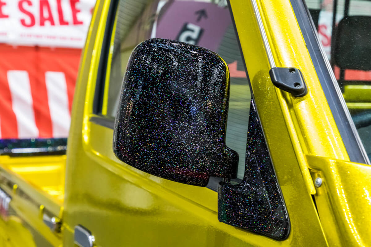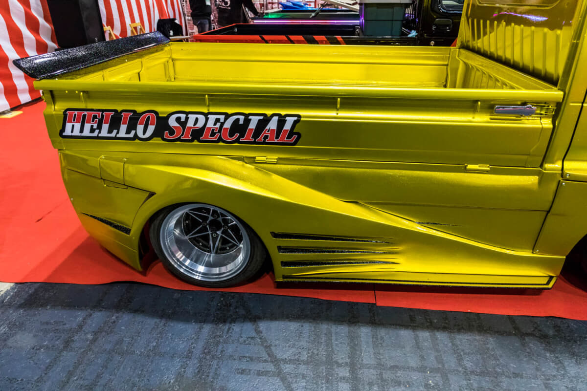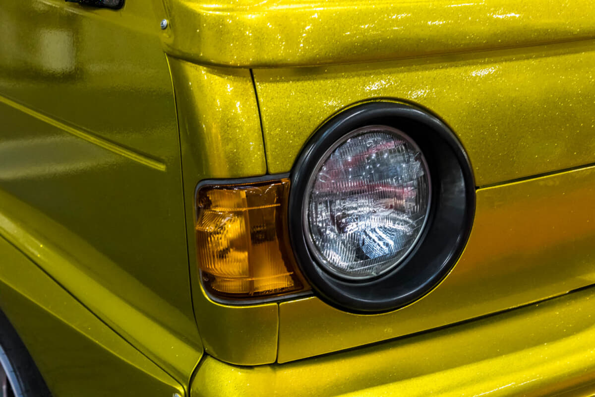 そんな、はろーすぺしゃるの数あるカスタム軽トラの中で、周囲とは雰囲気の異なる1台がオーラを放っていた。丸目ヘッドライトのちょっと古い軽トラックのカスタムだ。キャンディゴールドでペイントされた車両は、ほかの車両同様にフルカスタムを受けている。ビンテージ軽トラがベースということもあって、ギャラリーの注目を集めていた。そこで、はろーすぺしゃる代表の小田さんにお話を伺ってみた。