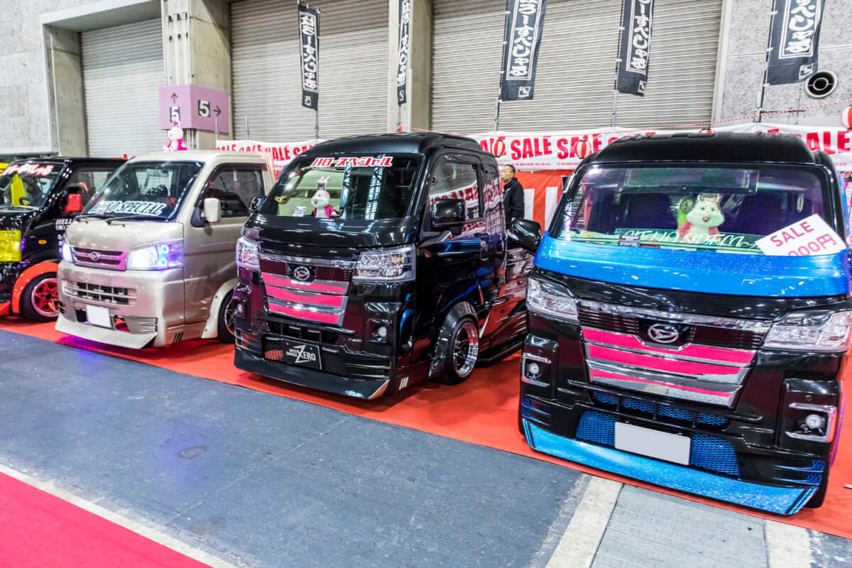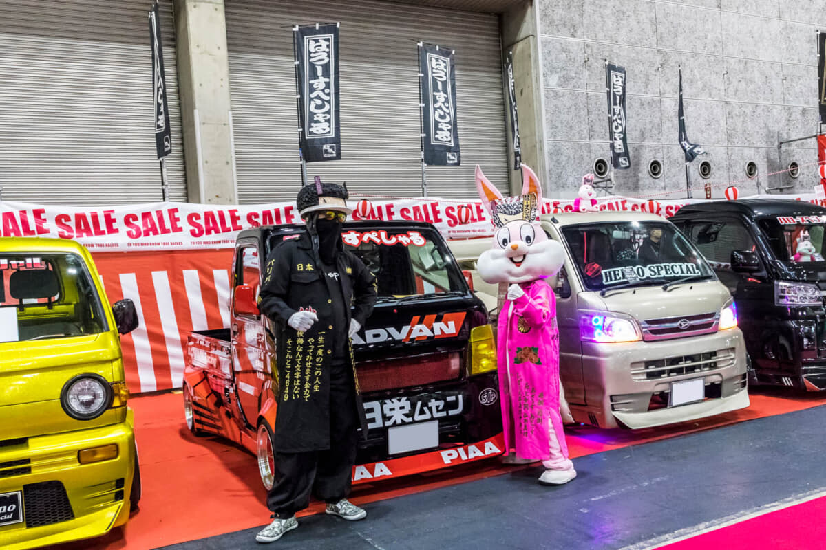 大阪オートメッセ2025(OAM)の広い会場を歩いていると、紅白幕と提灯で飾られた一角を発見。軽トラックのカスタムでおなじみの「はろーすぺしゃる」のブースだ。ド派手なカスタム軽トラがズラリと並び、ステッカーをはじめとしたグッズ類も大人気。また特攻服や着ぐるみを着たスタッフがお立ち台で踊るのも定番で人気となっている。