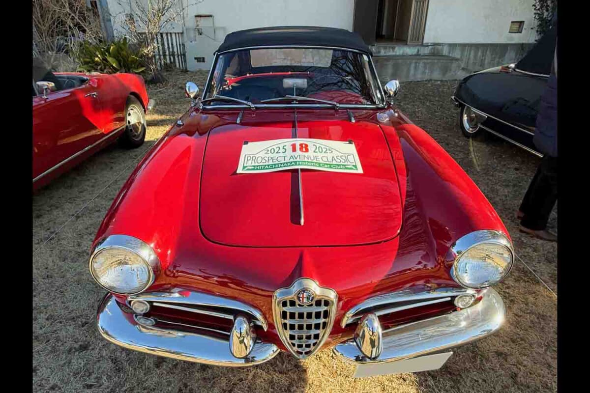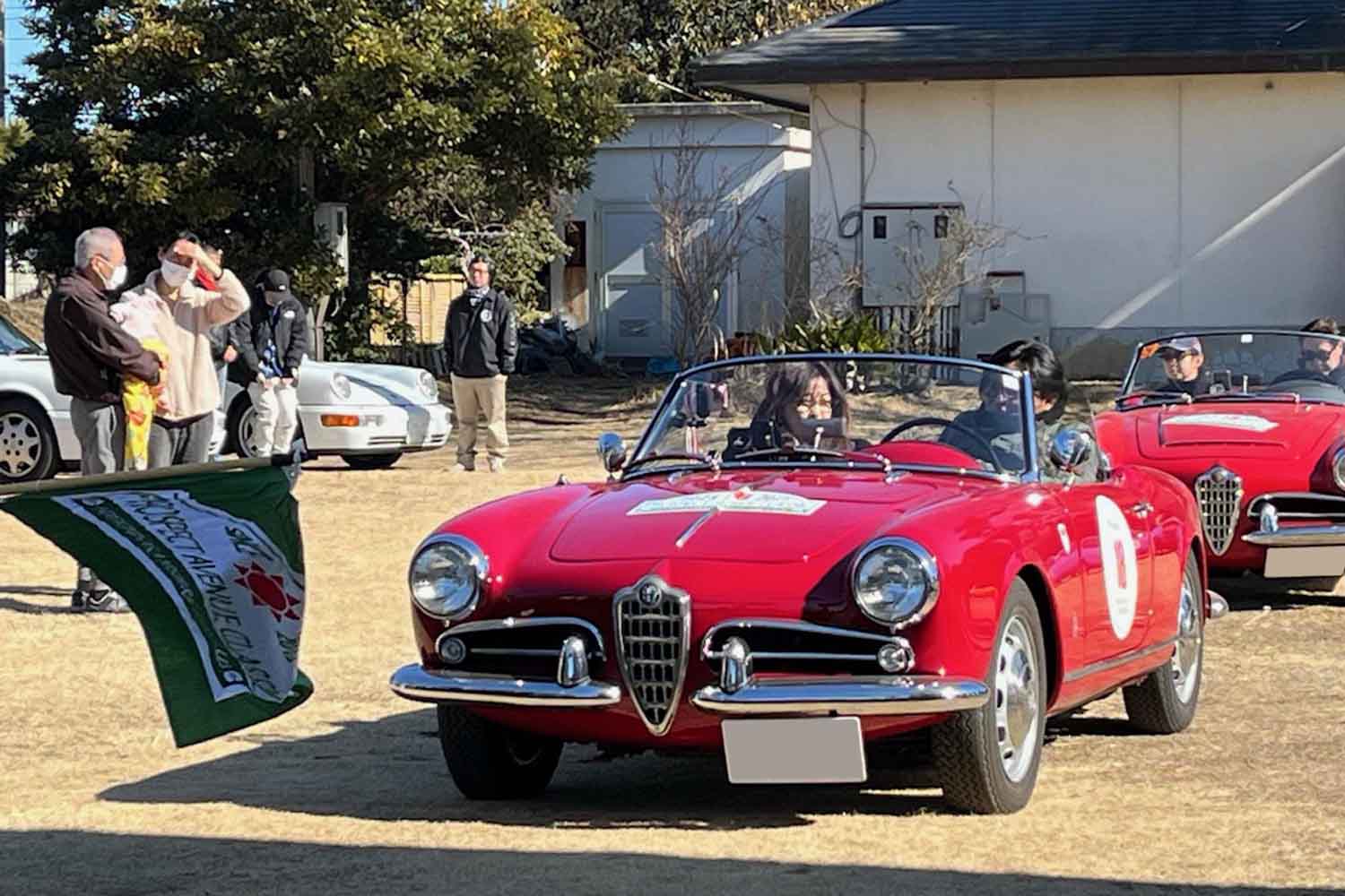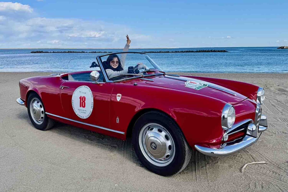 わたくしが乗るクルマは18号車の1958年式のアルファ ロメオ「ジュリエッタ スパイダー」で、今回もモータージャーナリスト桐畑恒治さんと参加。5年ほど前ぐらいからはわたくしもコ・ドライバーで参加しているのよ~。