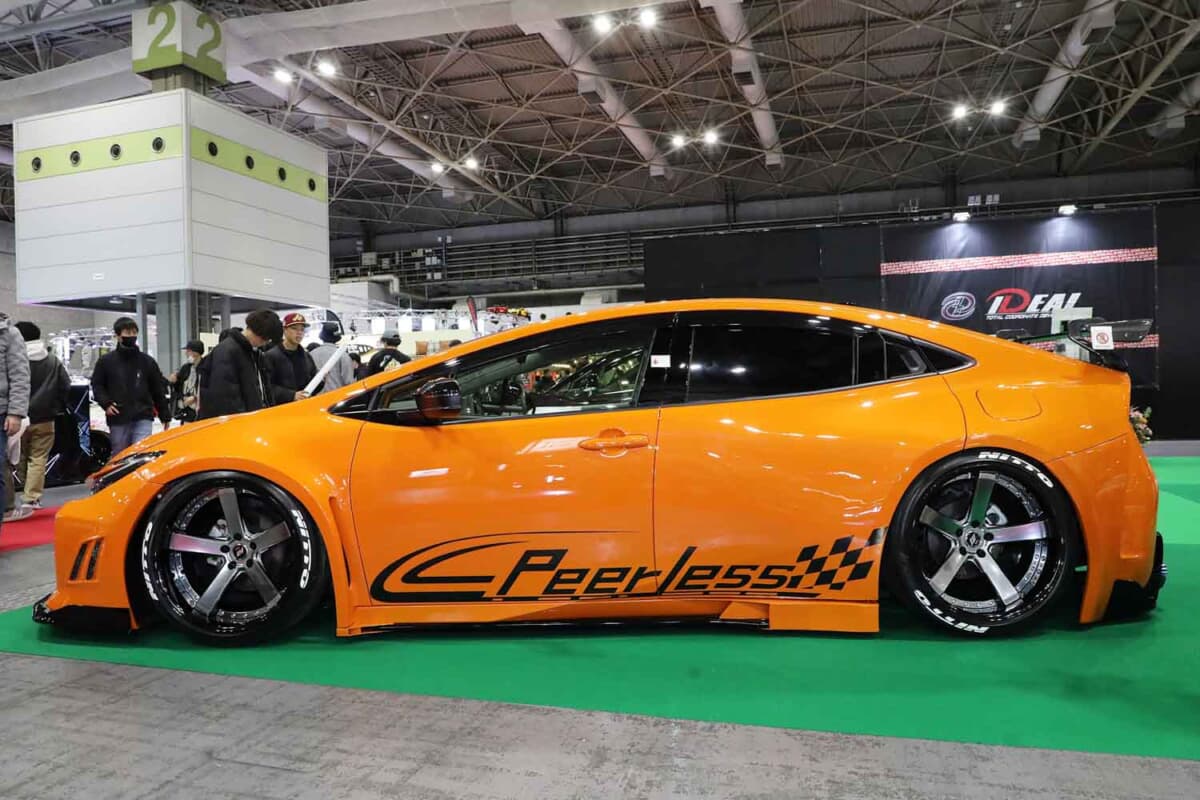 大阪府和泉市に店舗を構えドレスアップやワンオフ製作で高い評価を得ているピアレスが手がけたトヨタ現行型60系「プリウス」が大阪オートメッセ2025の会場で話題となっていた。フロントフェイスに「クラウンスポーツ」のようなハンマーヘッドデザインを盛り込んだデザインが特徴のプリウスを、美しくなめらかなフォルムを持つワイドボディとスポーティさを強調するメリハリを効かせたエアロパーツによって新世代のアーバンスポーツセダンとして表現する。