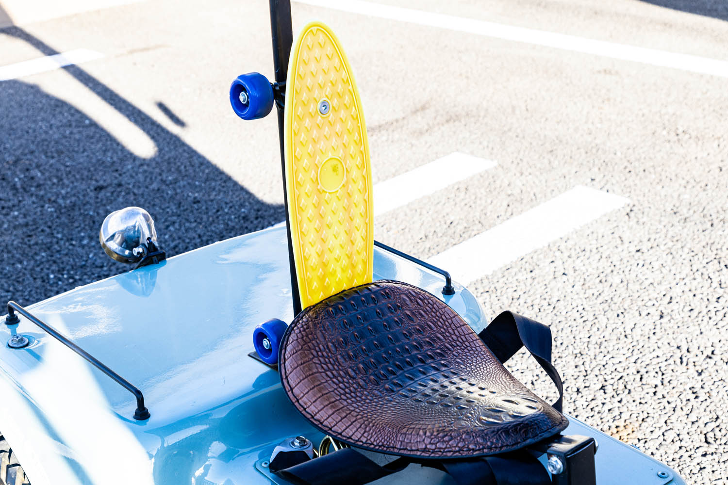 基本のボディシェル自体はベース車両のままだが、ボディはグレーがかった淡いブルーに全塗装。インパネやシート、ヘッドライトやタイヤなどもサイバーパンクなレトロ調パーツに交換され、全体のクラシカルかつワイルドな姿は、1960年代に流行したビーチカーやバギーのごとき風情となっている。