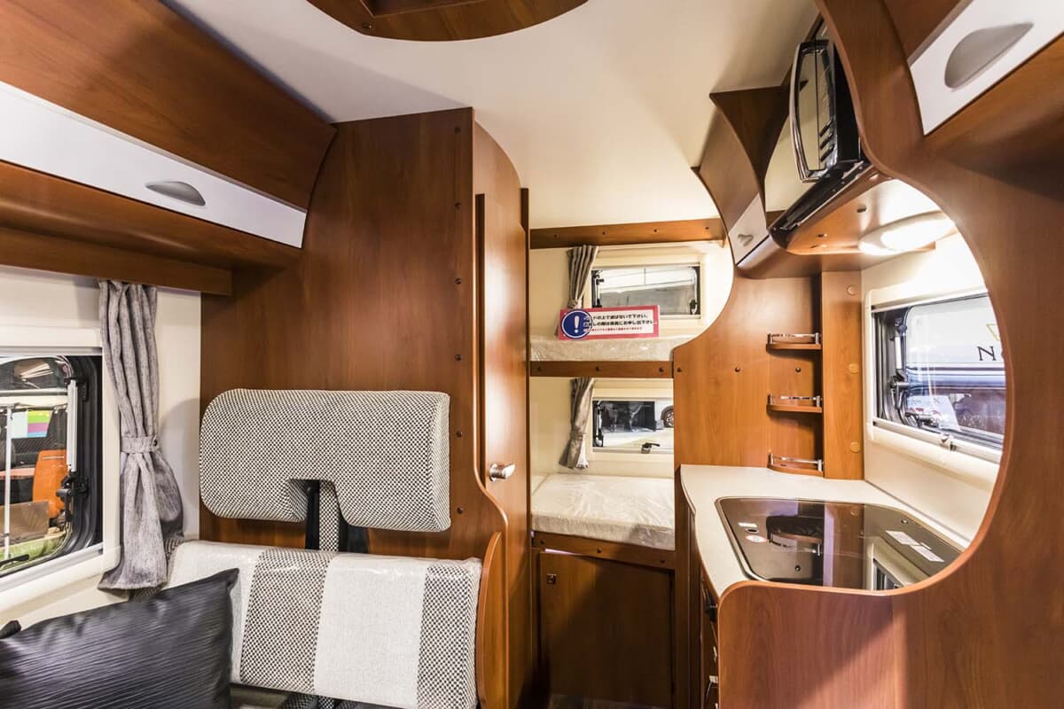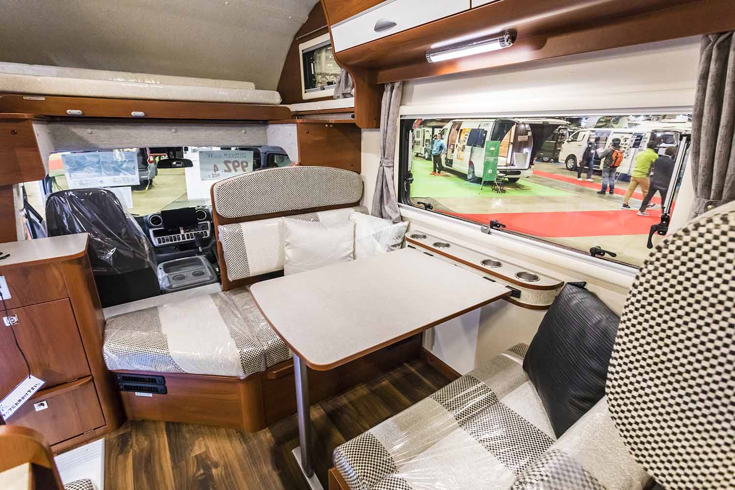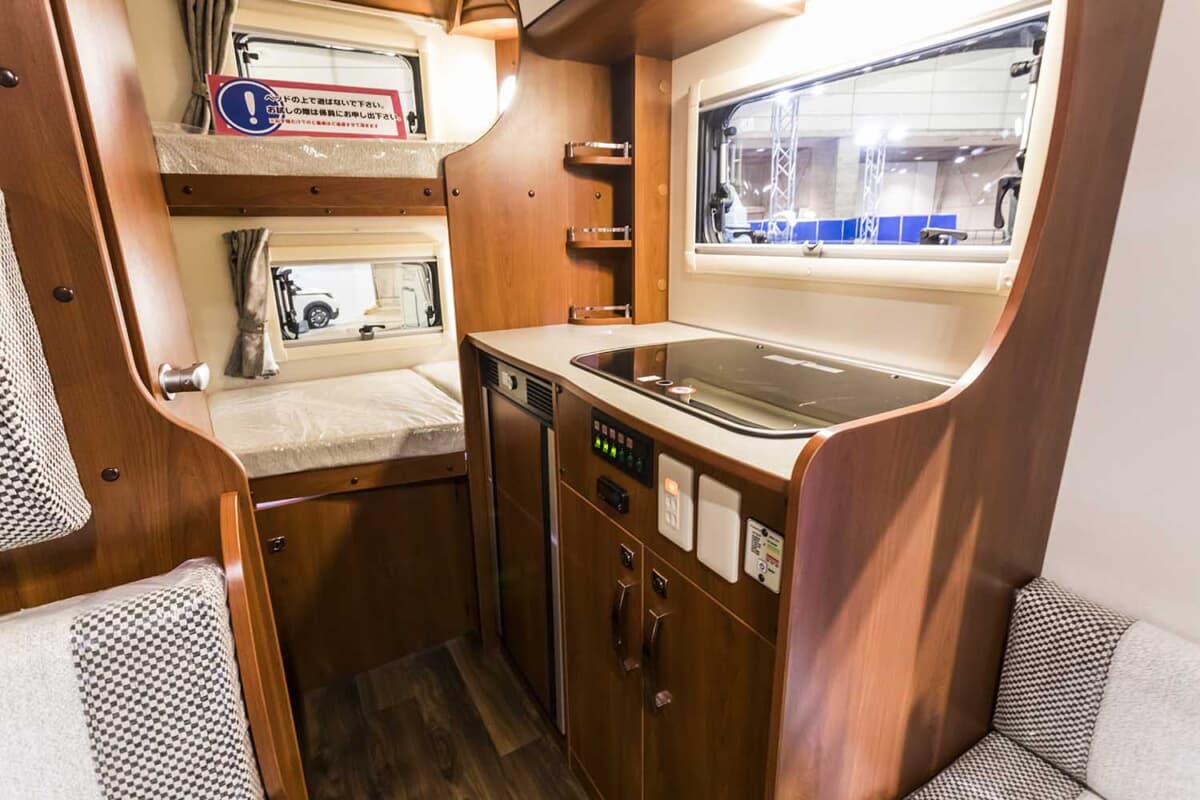 左側面のドアを開けると、ウッドを多用した落ち着いた室内空間が広がる。中央にはテーブルを挟んだダイネットが配置されており、夜間は幅90cmのベッドに変わる。キッチンやマルチルームを挟んで車体後部に目を向けると、常設の2段ベッドが設置されており、ベッドとしてだけでなく、キャンプギアの収納スペースとしても活用可能だ。