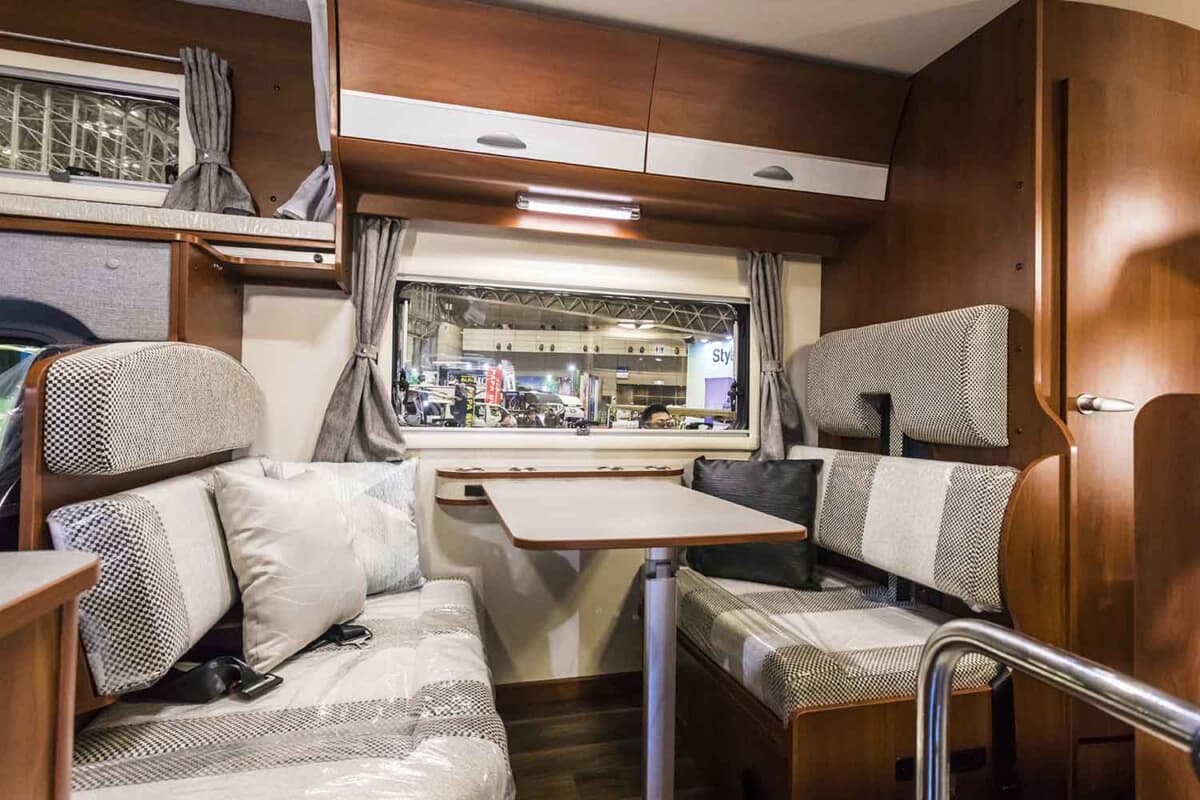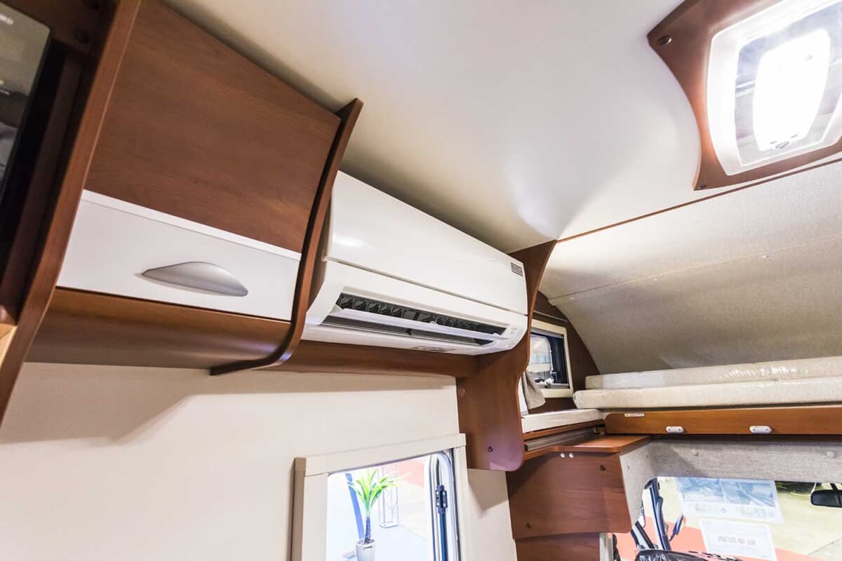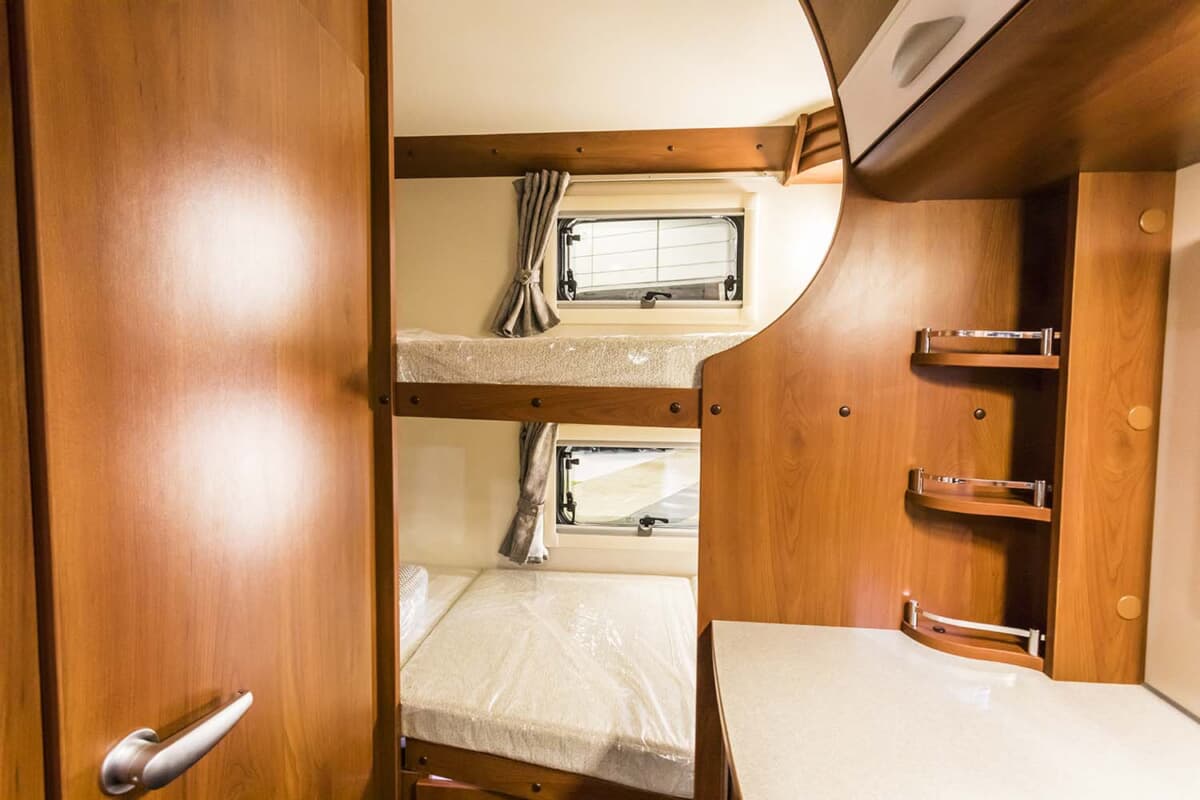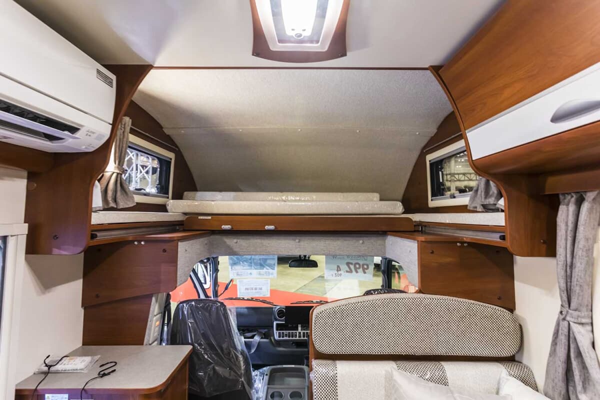 左側面のドアを開けると、ウッドを多用した落ち着いた室内空間が広がる。中央にはテーブルを挟んだダイネットが配置されており、夜間は幅90cmのベッドに変わる。キッチンやマルチルームを挟んで車体後部に目を向けると、常設の2段ベッドが設置されており、ベッドとしてだけでなく、キャンプギアの収納スペースとしても活用可能だ。