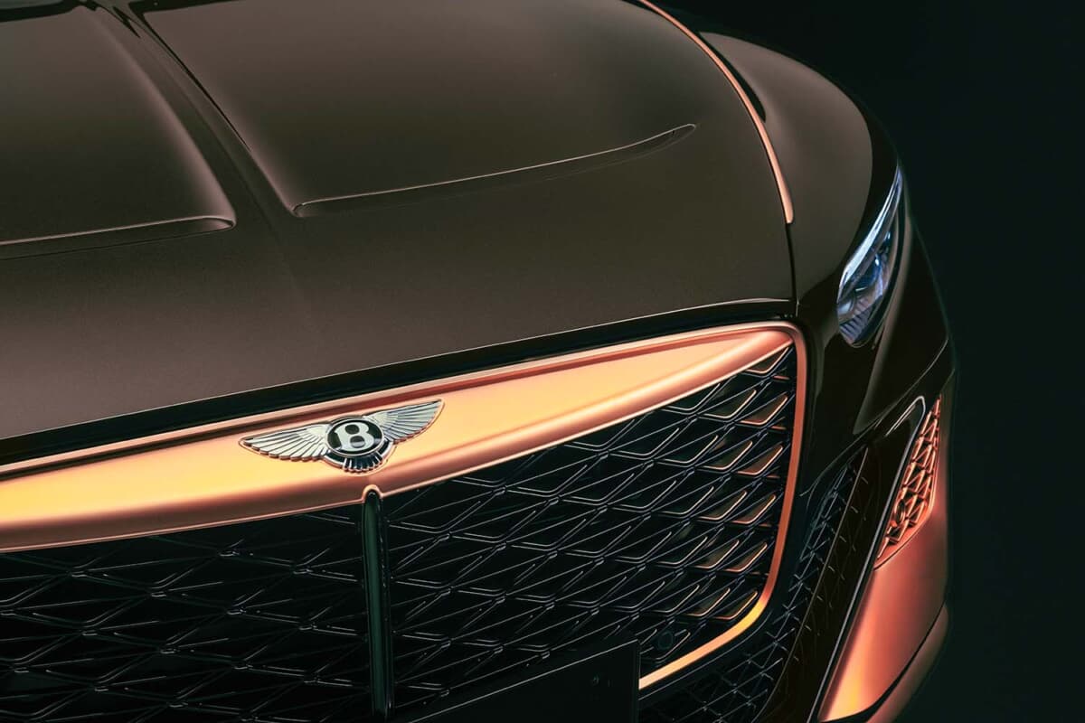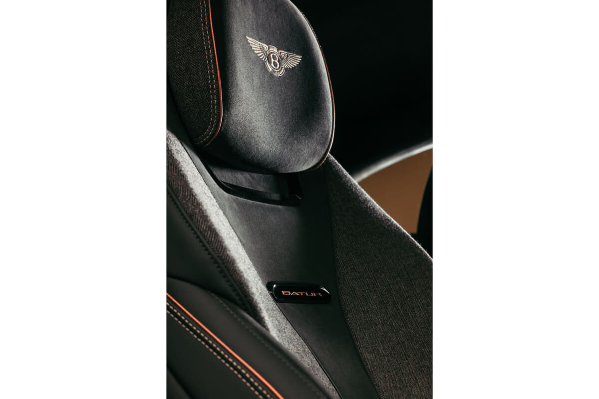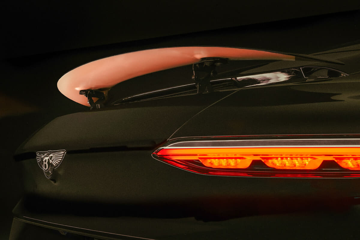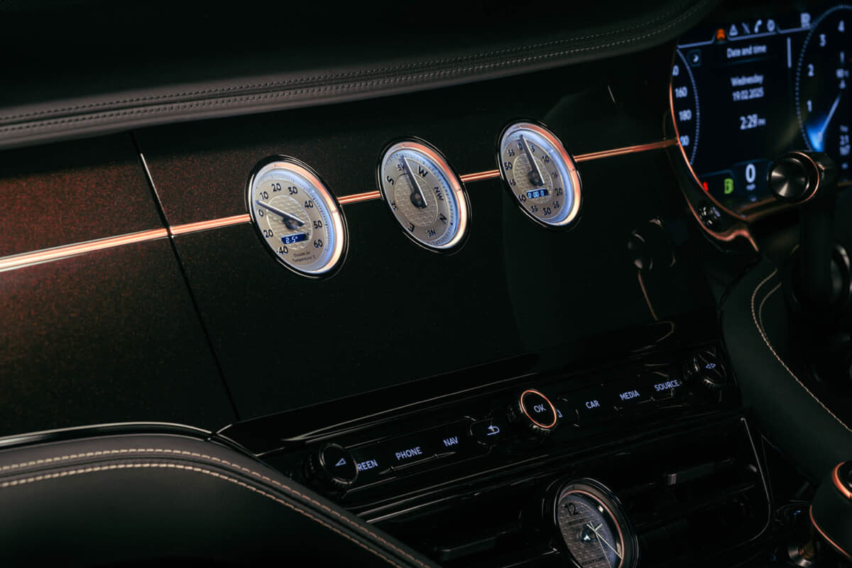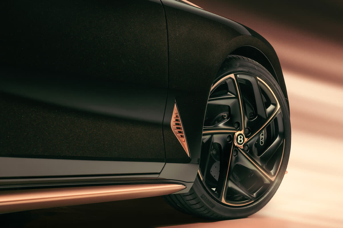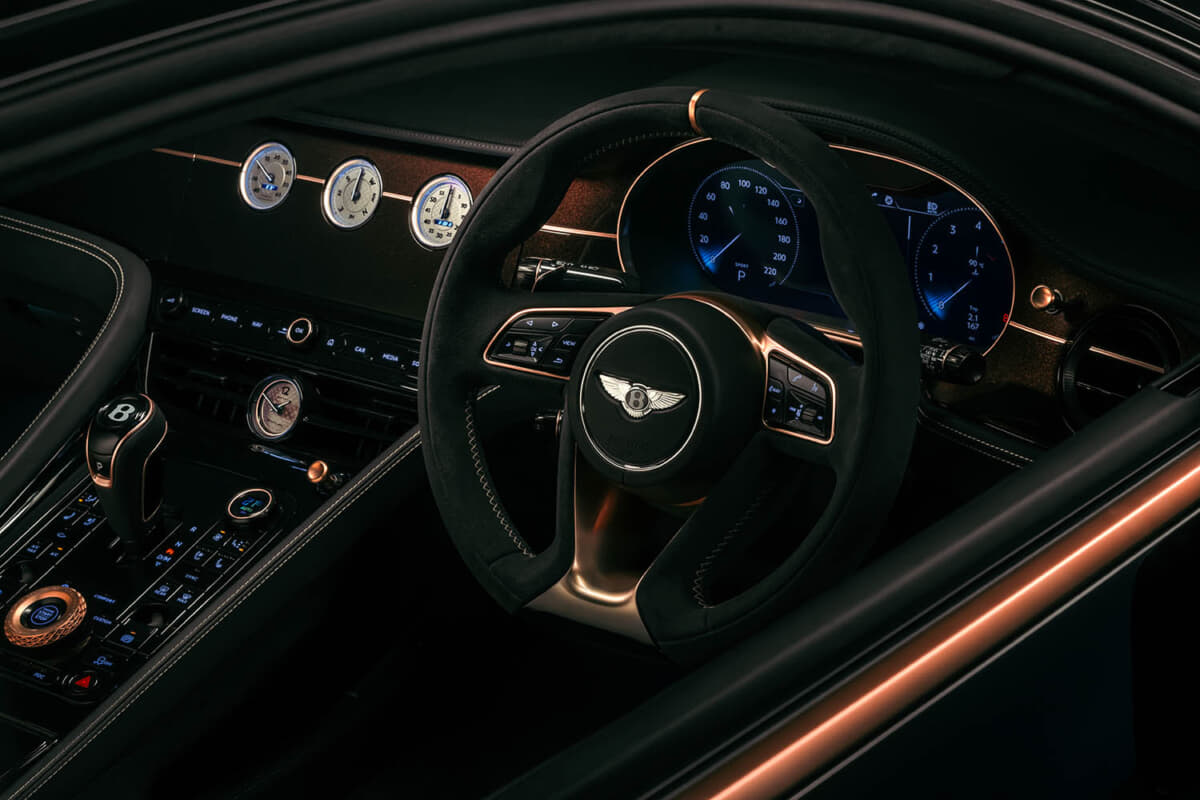 インテリアは、ダークトーンのレザーやフェイシア、ファブリック素材がローズゴールドの輝きによって際立っている。また自動車業界初となる金属を層ごとに積み重ねて精密なパーツを作り出す革新的な製造方法であるベントレーの金属積層造形(AM)3Dプリンティング技術により、最大210gのホールマーク付き18Kローズゴールドが随所にあしらわれている。使用部品は、ドライブモードセレクター、ベントレーの象徴的なオルガンストップベンチレーションコントロール、そしてステアリングホイールのローズゴールド製インサートマーカーなどが含まれ、ビスポークの精緻なクラフツマンシップを際立たせている。